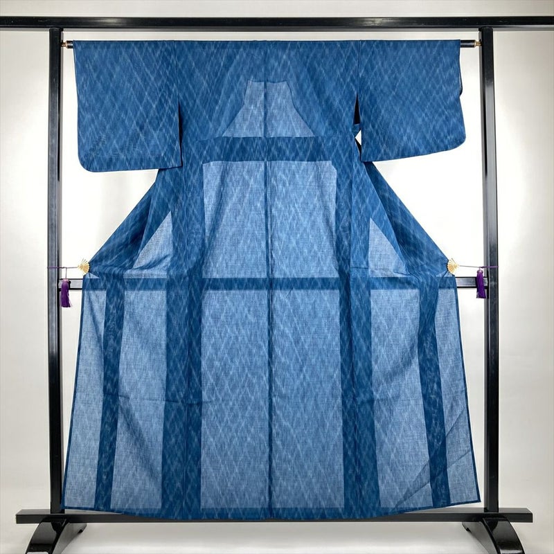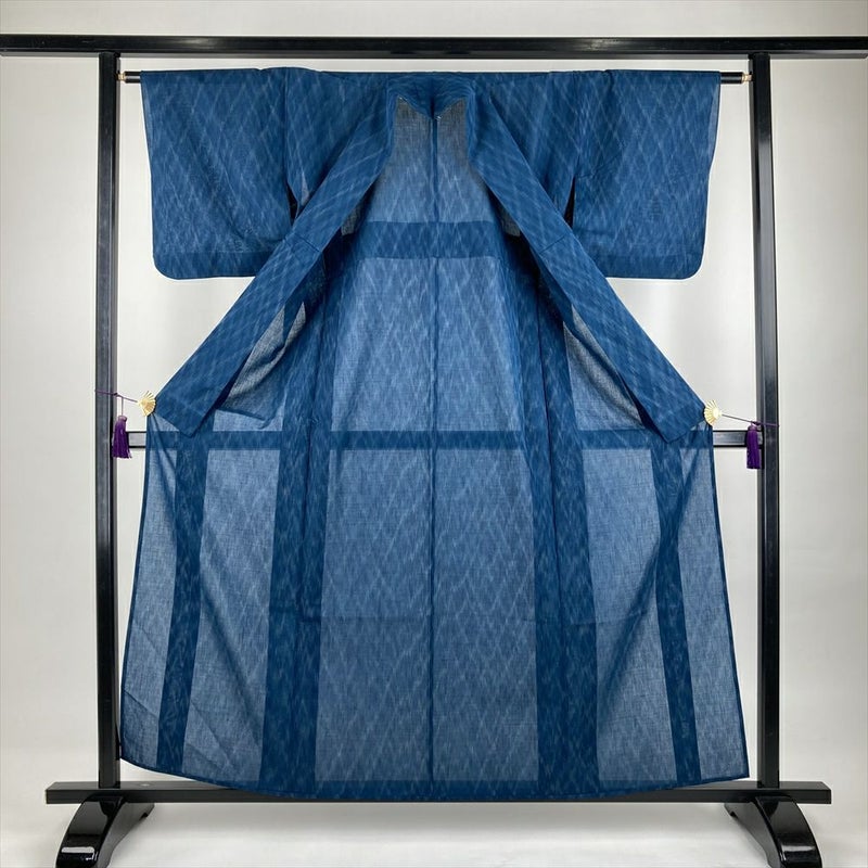 (中古)夏紬 藍色 青 カジュアル 織り 菱 絣調 S【身丈】155cm【裄丈】62.5cm