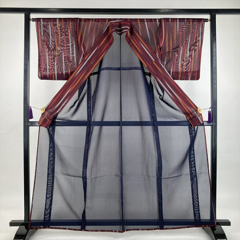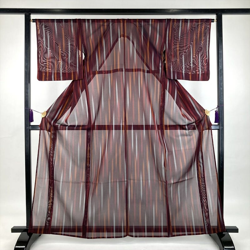 (中古) 夏紬 臙脂色 赤色カジュアル 途切れ縞 矢羽根 M【身丈】161cm【裄丈】65cm