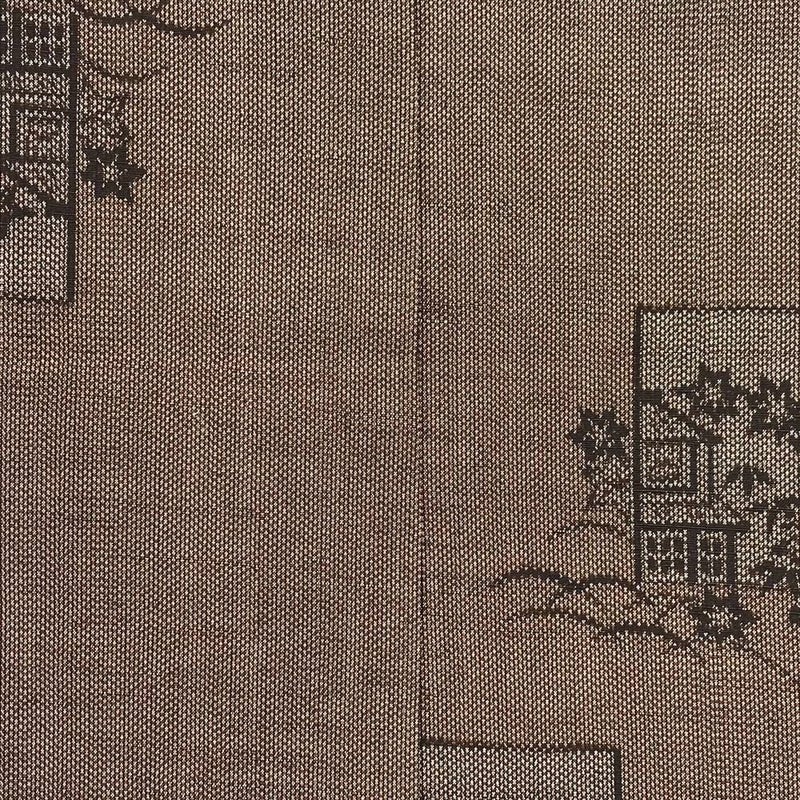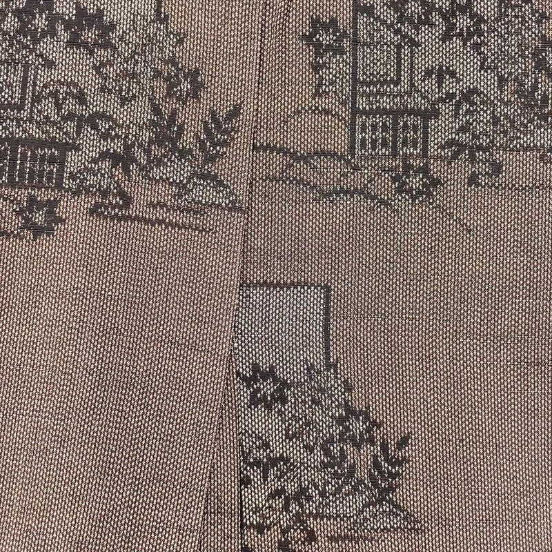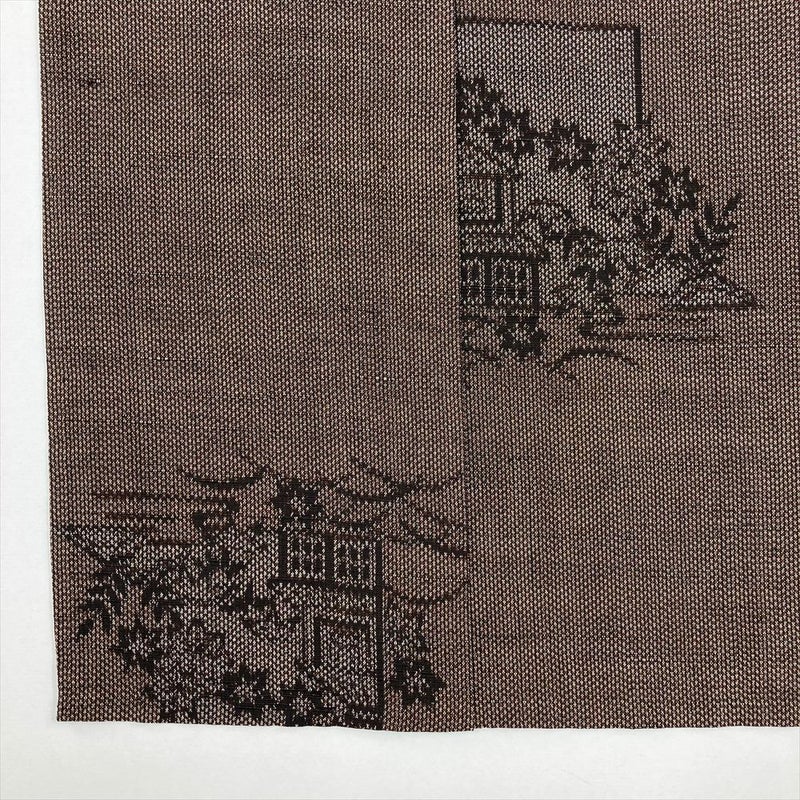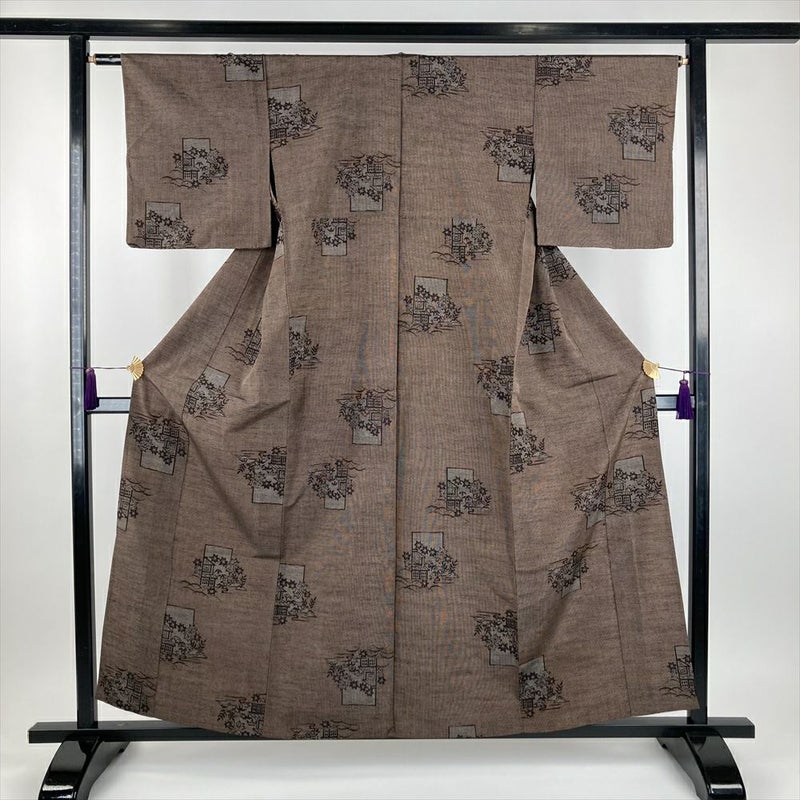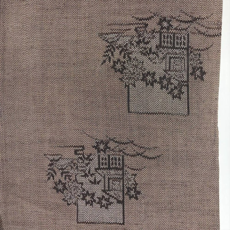 (中古) 夏紬 茶色 カジュアル 色紙 家屋 紅葉 竜胆 露芝 SS 【身丈】153cm【裄丈】63.5cm