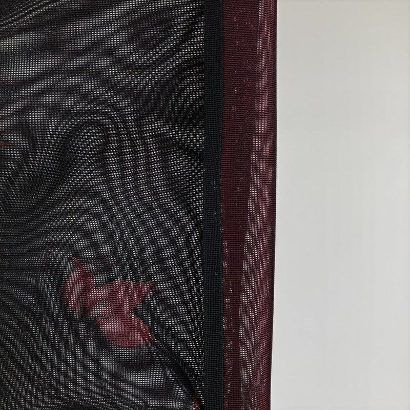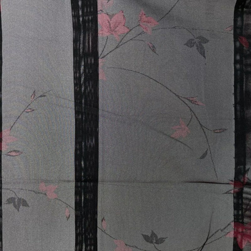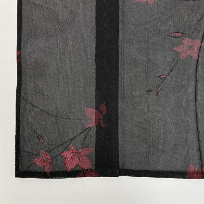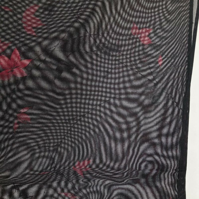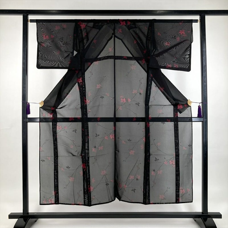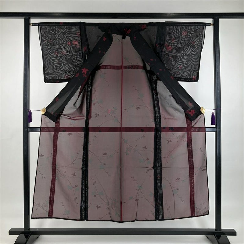 (中古) 夏紬 黒色 赤色 カジュアル 五弁の花 SS【身丈】146cm【裄丈】62.5cm