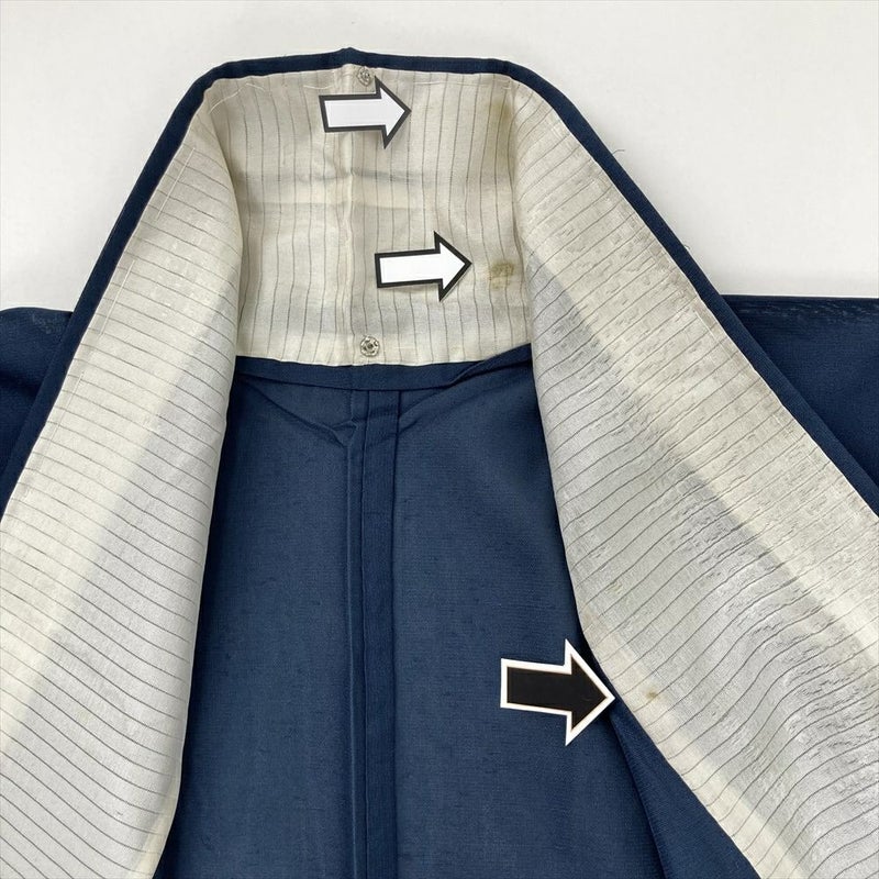 夏紬は、通気性があり軽やかです、絽や紗のようにラインを拾いすぎず、麻のようにシワになりにくく、蒸し暑い時期に適した快適な着心地です。夏のカジュアルシーンに活躍いたします、デザイン性も高いものが多いので、お気に入りの1枚にぜひ加えていただきたく存じます。衿裏に生地の弱りと汚れがございます保存臭がややございます。