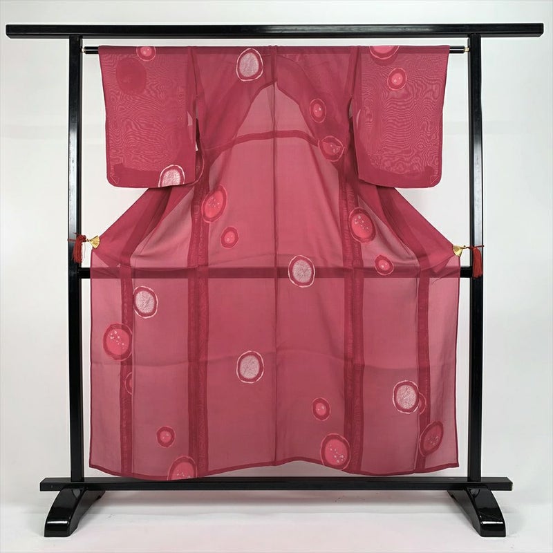 (中古)夏紬 ピンク カジュアル 銀糸 丸 飛び柄 未洗い【身丈】149.5cm【裄丈】63.5cm