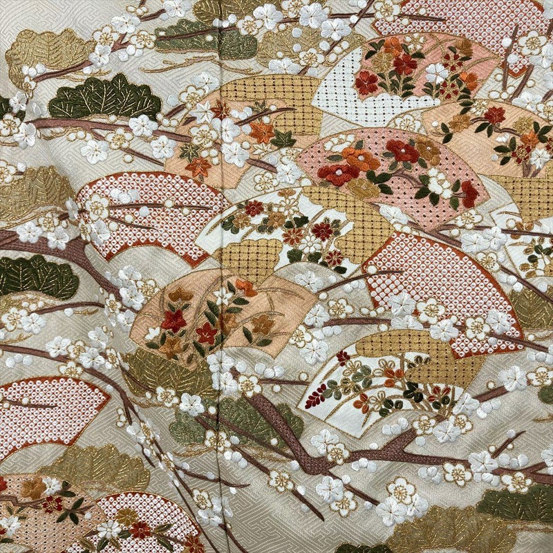 しっとりとした正絹の地に、熟練の職人技による総刺繍が施され、松に白梅、扇面に四季花といった吉祥文様が、立体感豊かに表現されています。