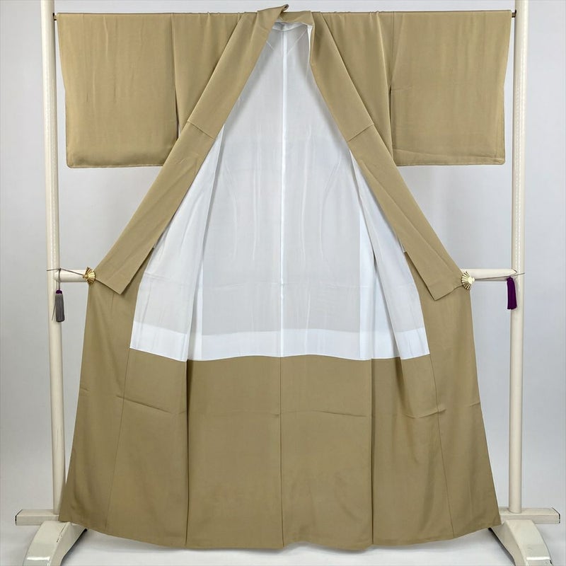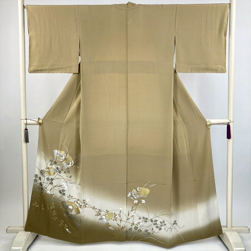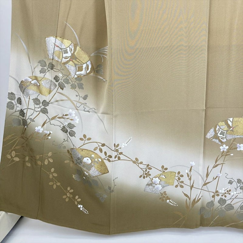 (中古) 色留袖 カーキ 金 黄土色 フォーマル 琳派 扇面 袷 絹【身丈】156cm【裄丈】67cm