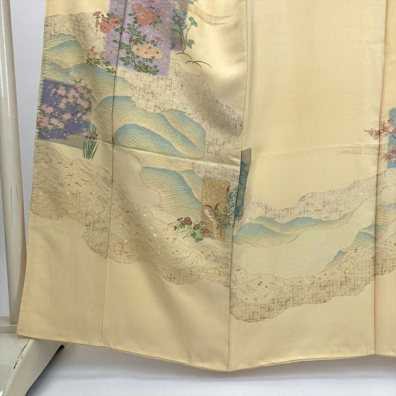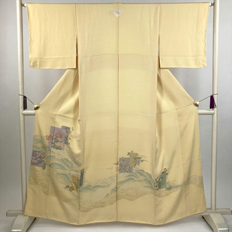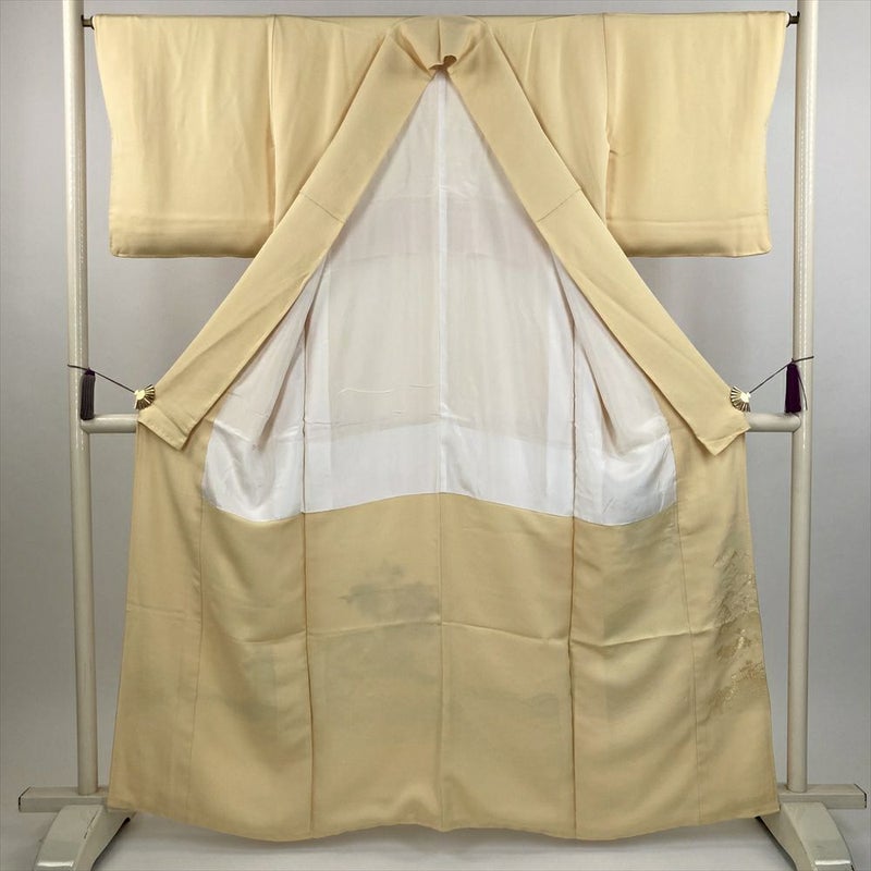 (中古) 色留袖 卵色 黄色 フォーマル 道長取り 色紙文 袷 絹 【身丈】156cm【裄丈】65cm