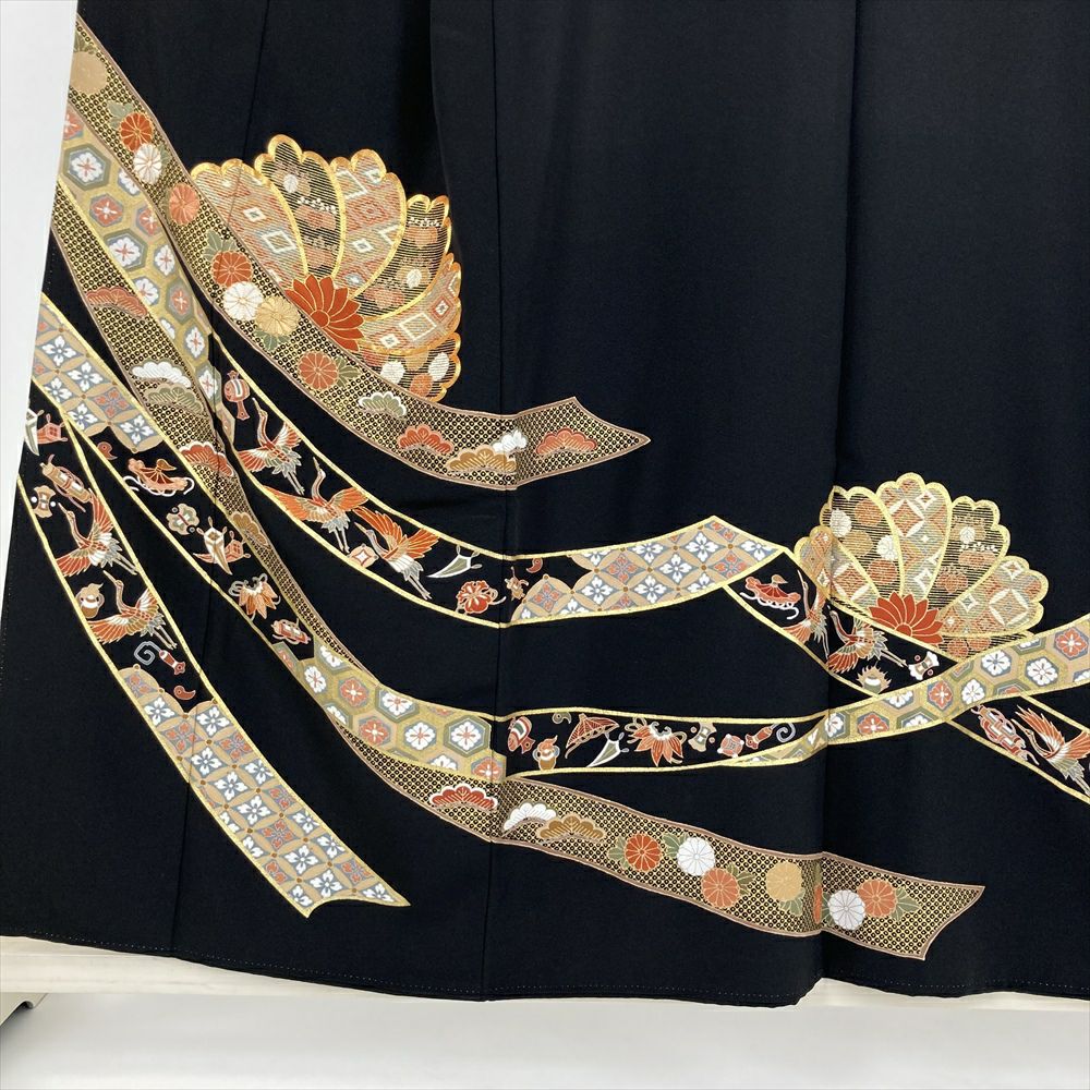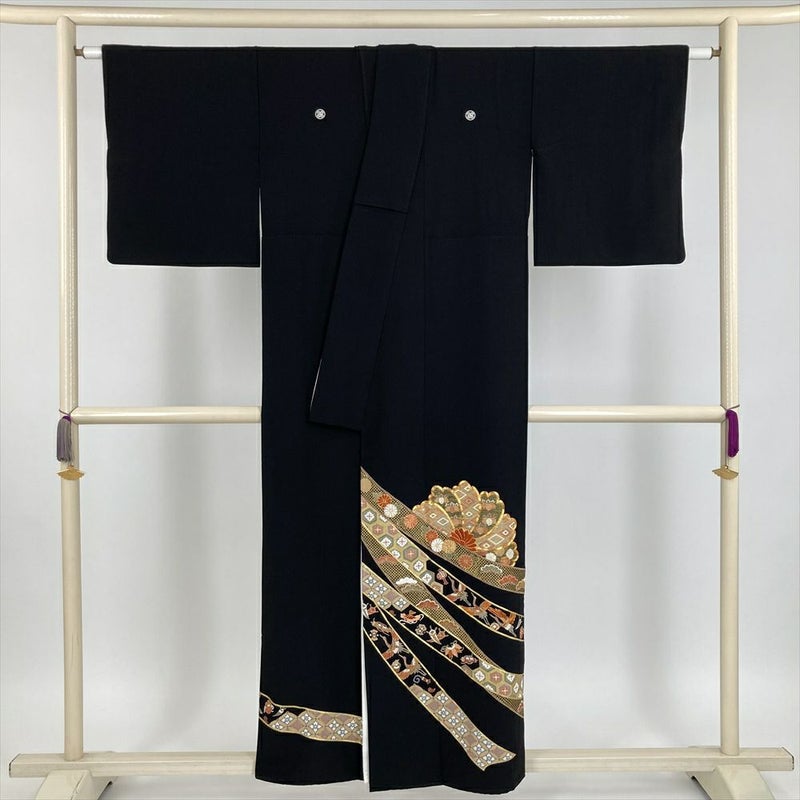 (中古) 黒留袖 黒色 フォーマル ちりめん 染め金彩 刺繍 熨斗 袷 絹 【身丈】151.5cm【裄丈】63cm