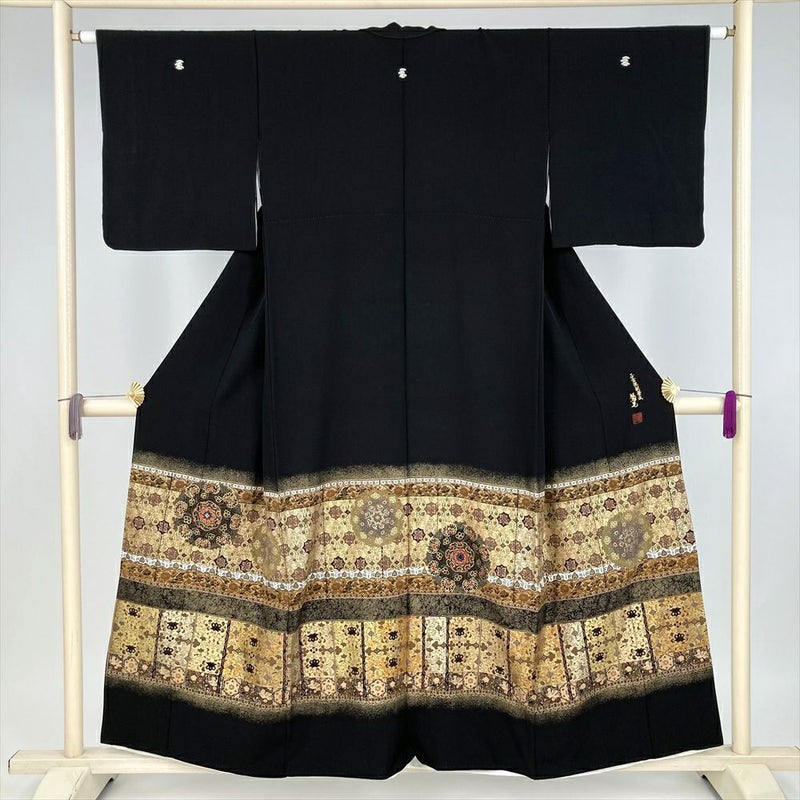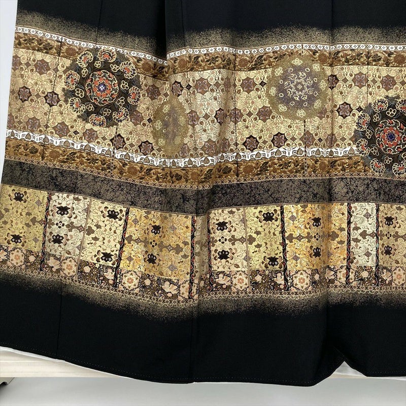 この黒留袖は、伝統的な黒留袖の概念を覆す、オリエンタルな横段模様が印象的な一着です。煌びやかな金彩が、異国情緒あふれる文様を際立たせ、個性的な美しさを演出します。