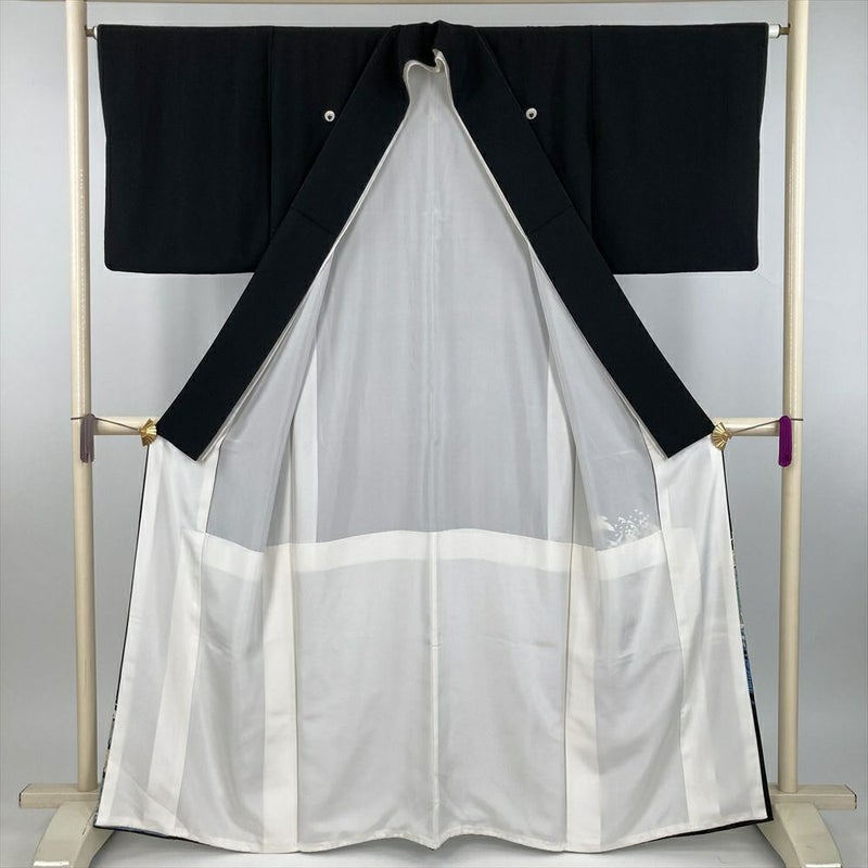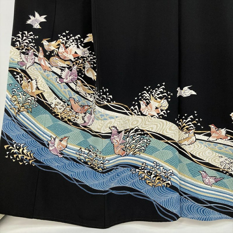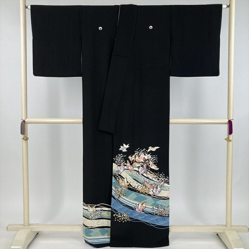 (中古) 黒留袖 黒 フォーマル 金彩 刺繍 波に鳥 袷 絹【身丈】157.5cm【裄丈】64.5cm