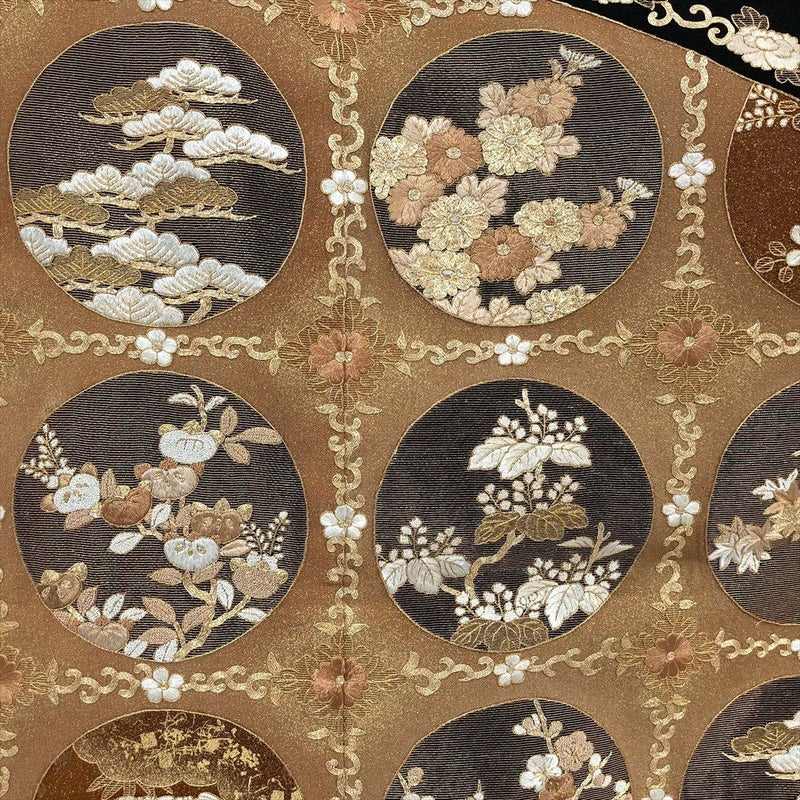 繊細な丸文の中に、日本の美しい四季の花々が咲き誇り、どこから見ても目を奪われる華やかさ。