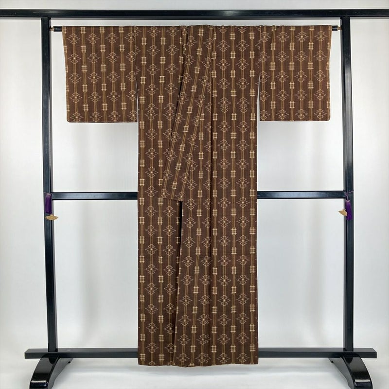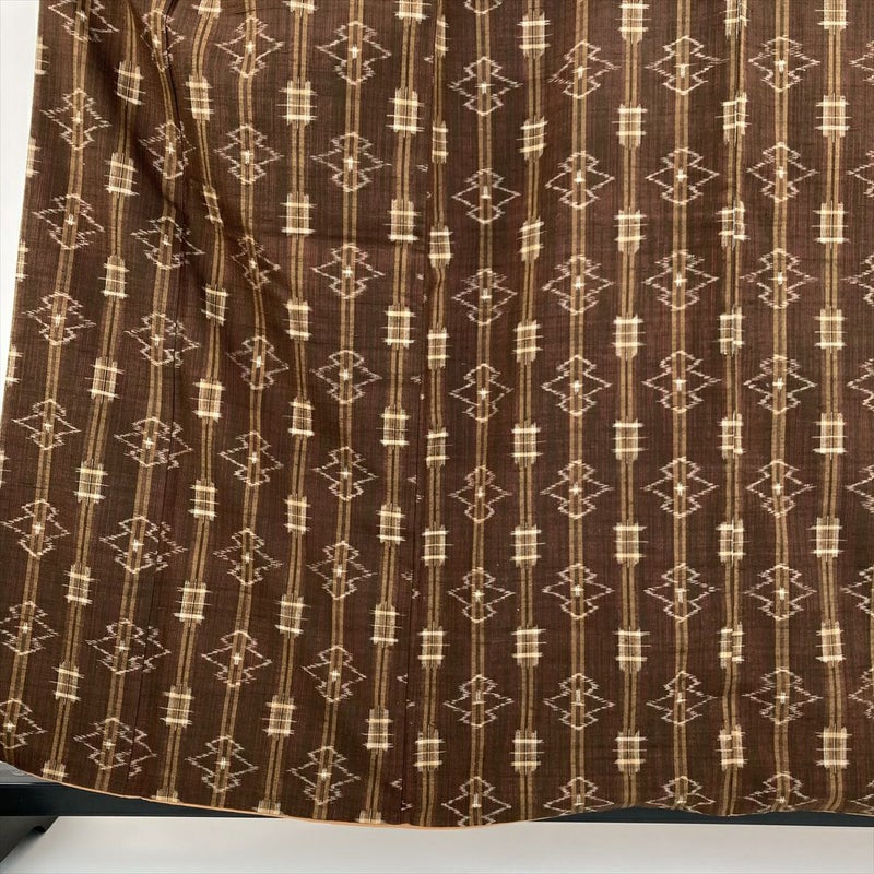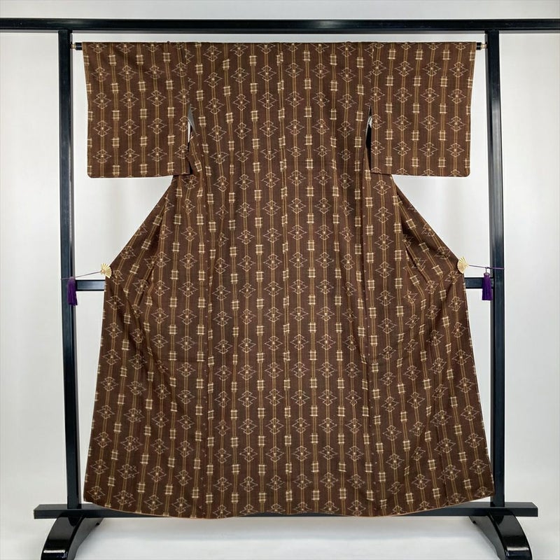 (中古)本場琉球絣 紬 茶色 カジュアル 手織り 鳥 袷【身丈】155.5cm【裄丈】64.5cm