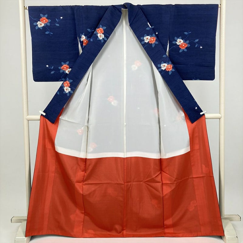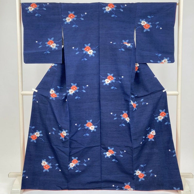 (中古) 紬 紺 カジュアル 椿 袷 絹【身丈】165cm【裄丈】67cm