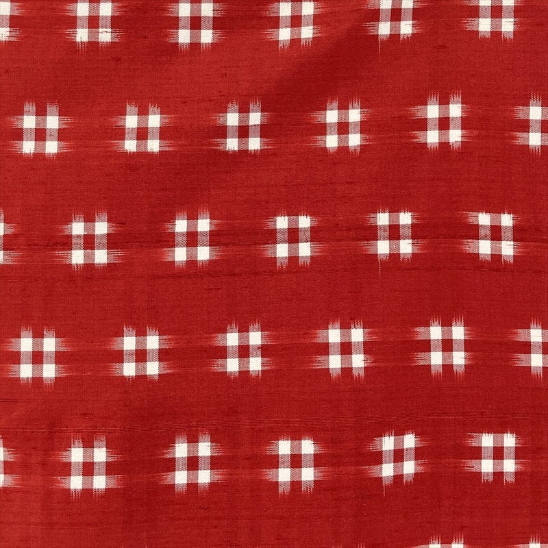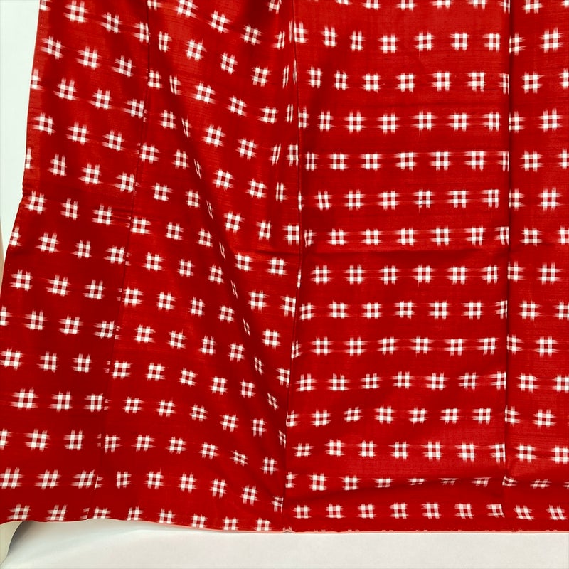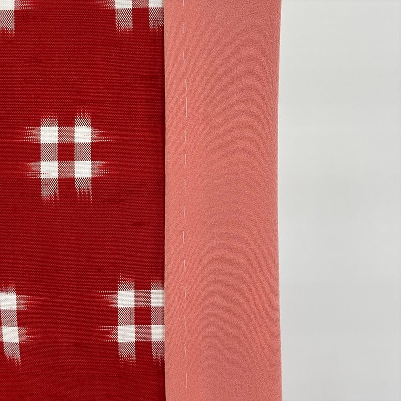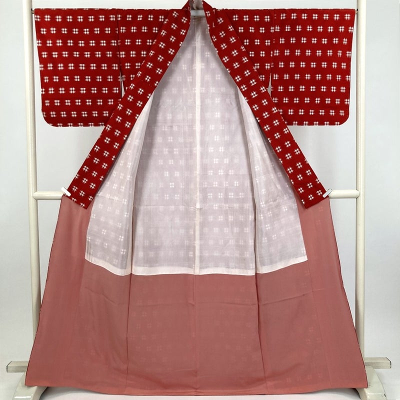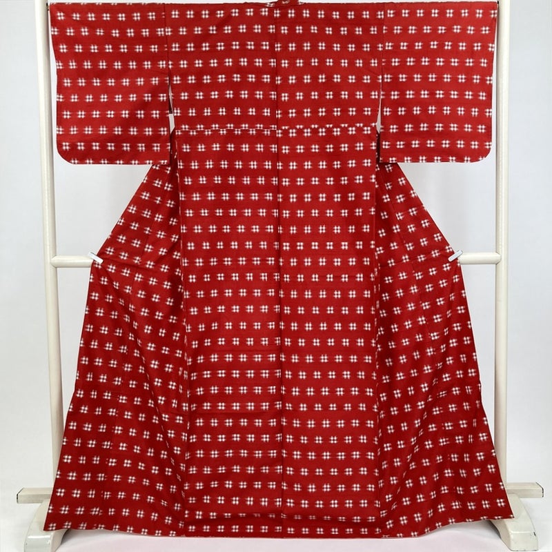 深みのある赤地に、白の井桁文様が映えるカジュアル向けの紬着物。