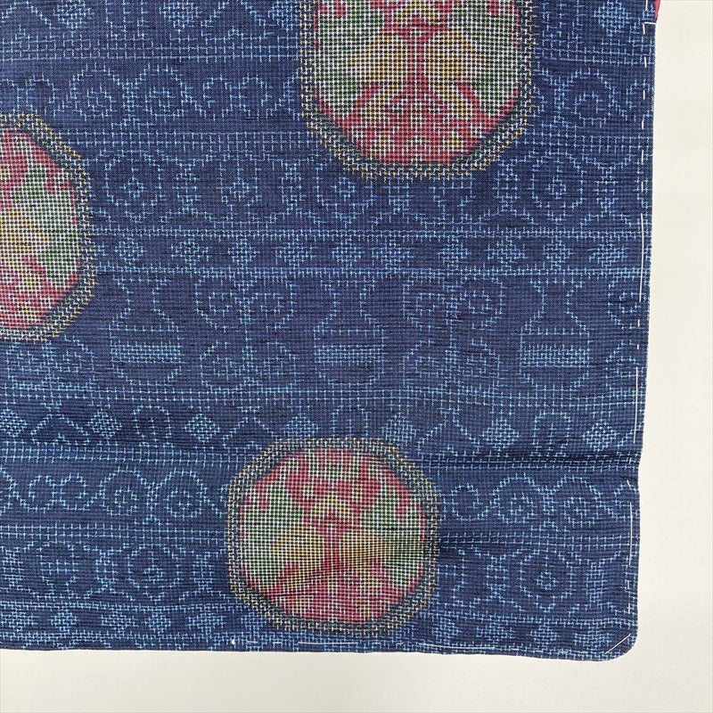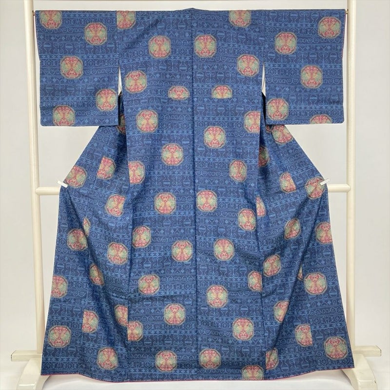 (中古) 紬 青 カジュアル オリエンタル 向かい鳥 袷 絹【身丈】161.5cm【裄丈】67cm