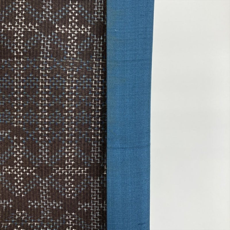 都会的な幾何学柄の絣に、地色と八掛が織りなす「色合わせの妙」が光る一着。