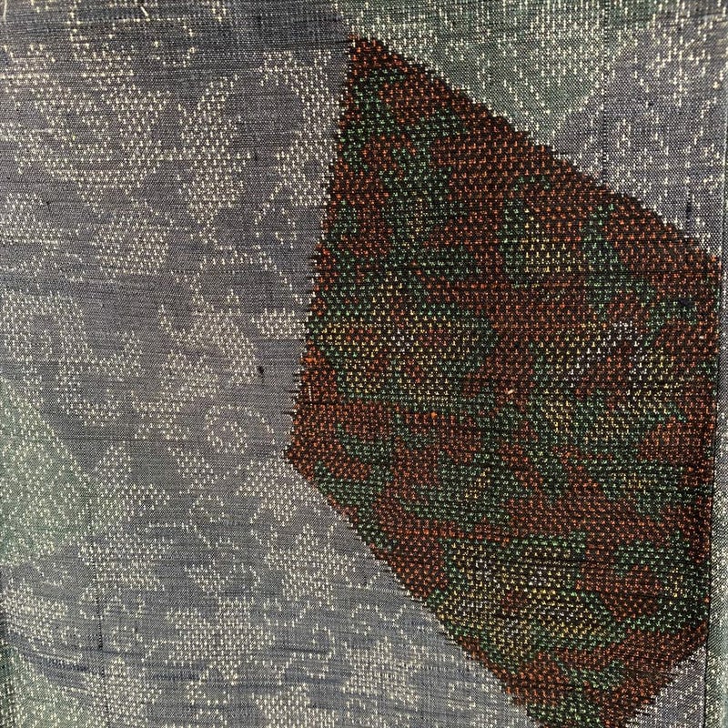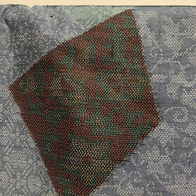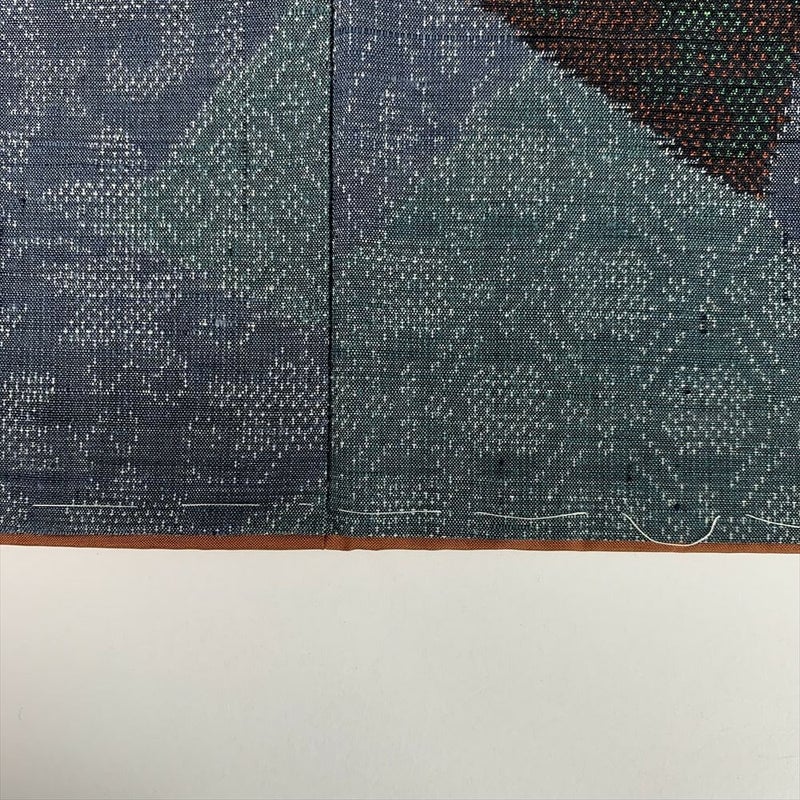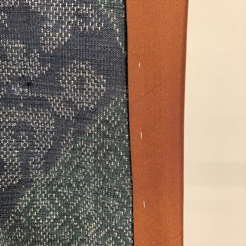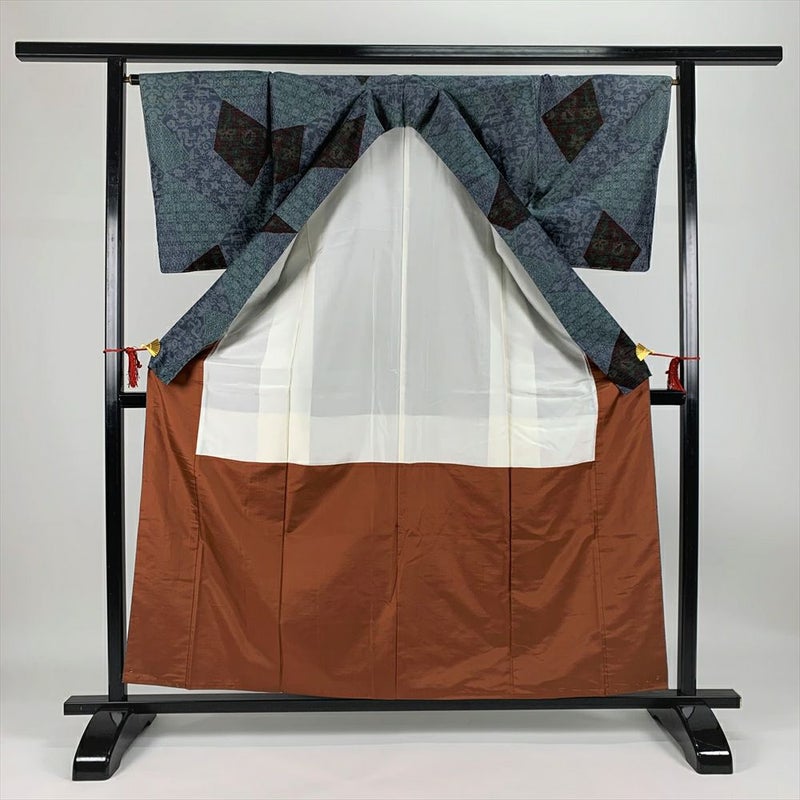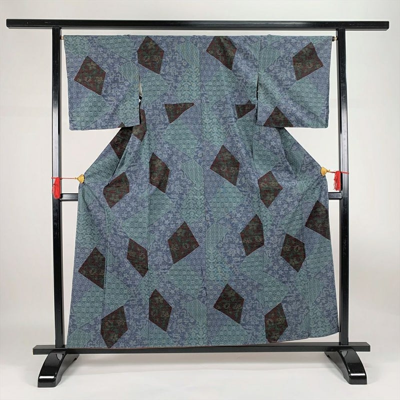 (中古)紬 カジュアル 青 袷 切りばめ 唐花 唐草 未洗い S【身丈】157cm【裄丈】64.5cm