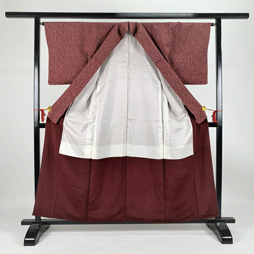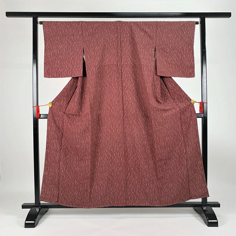 小紋に比べ、よりカジュアルな街着になります。柄や生地に産地の特徴がある物もあり、生産地に自生している植物の染料を使用している物が多いお着物になります。右後身頃と右外袖に小さな茶色いシミ、衿裏と胴裏に黄色いシミが見られますが、着用には問題のない程度と考えられます。しつけ糸あります。