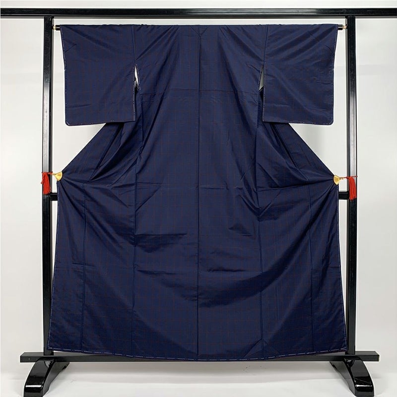 (中古)紬 紺 カジュアル 格子 袷 S【身丈】157.5cm【裄丈】65.5cm