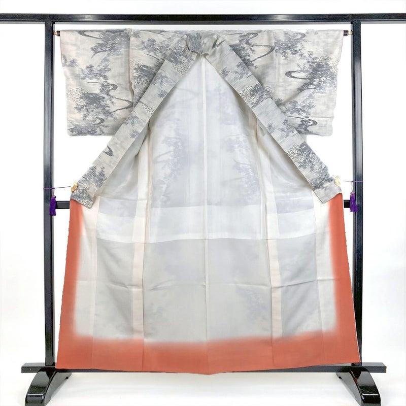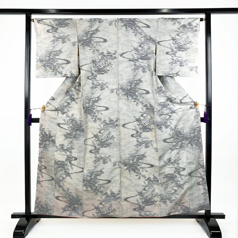 (中古)紬 薄灰 グレー カジュアル 織り 流水に遠山 袷 S【身丈】156.5cm【裄丈】65cm