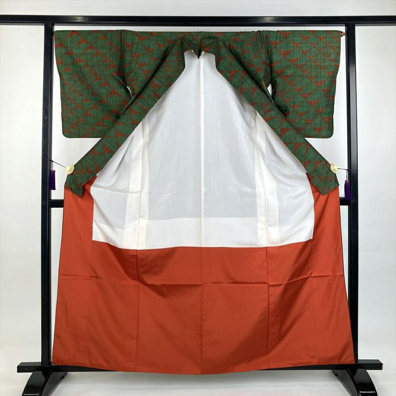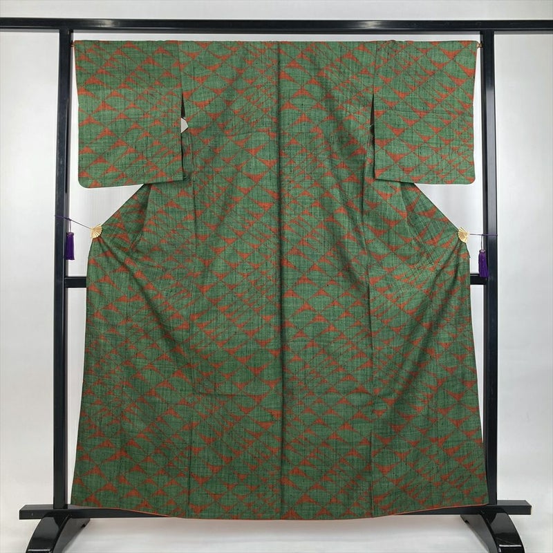 (中古)紬 緑 カジュアル 菱に扇 袷 S【身丈】158cm【裄丈】67cm