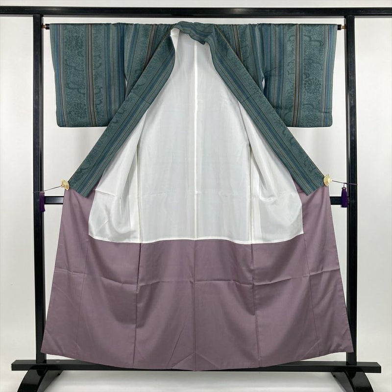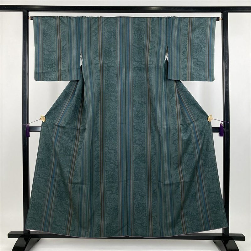 深みのある青緑が美しい紬。温もりが感じられる、ふっくらとした生地が特徴です。伝統的な縞模様に、菊の模様がモダンなアクセントを添え、着る人の心を穏やかに包み込みます。コンパクトなサイズ感ですが、状態は良好です。サイズが合えば、あなただけの特別な一着に。胴裏に汚れがございます。保存臭がややございます。