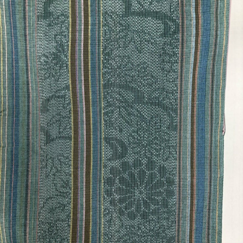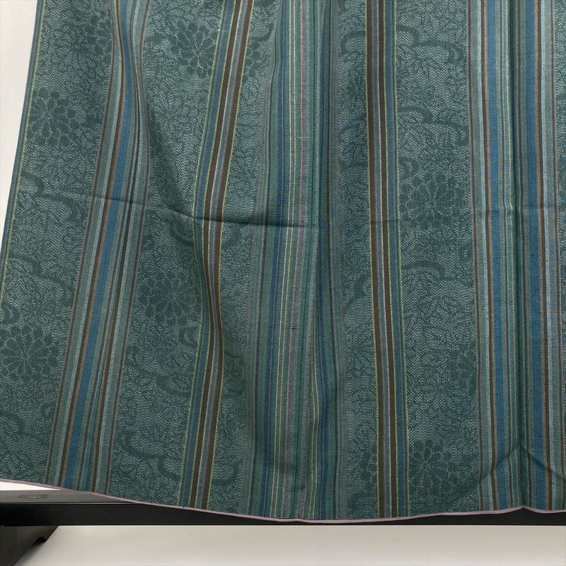 (中古) 紬 青緑色 カジュアル 縞 菊柄 袷【身丈】152.5cm【裄丈】65cm