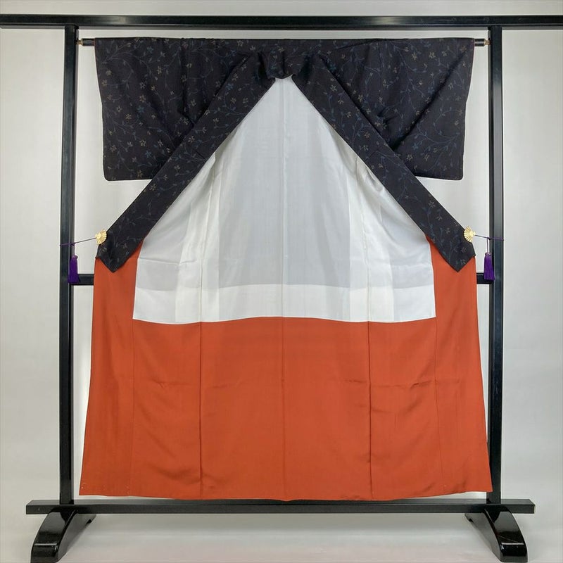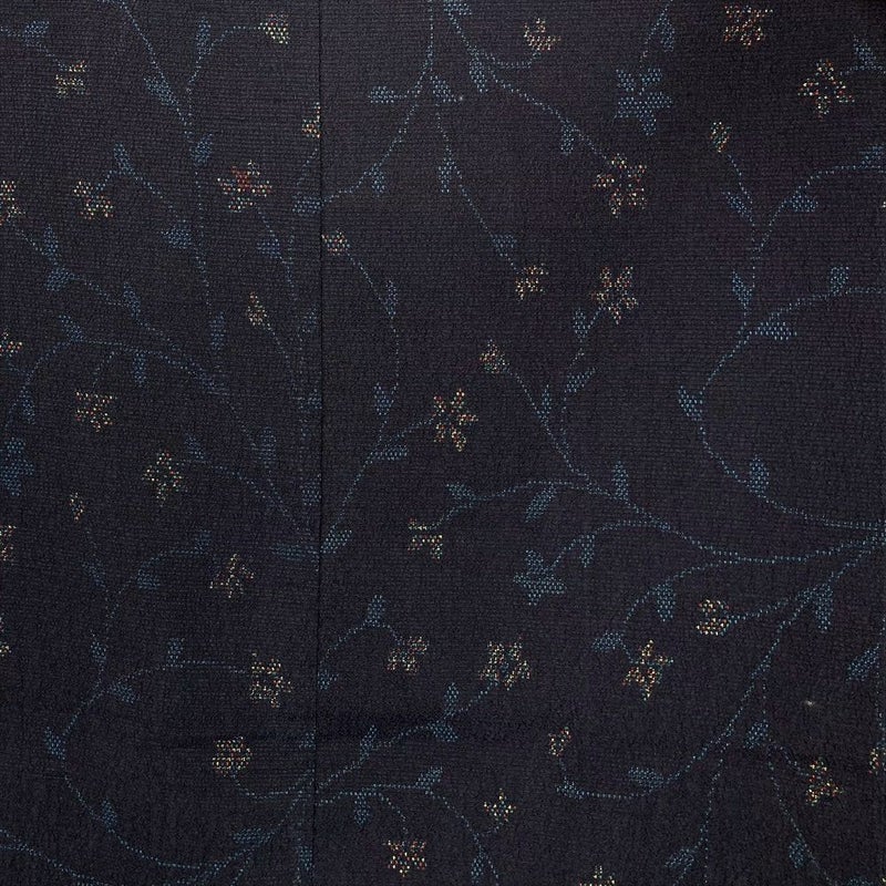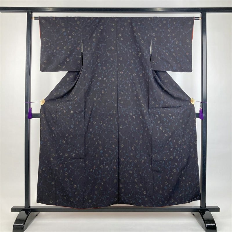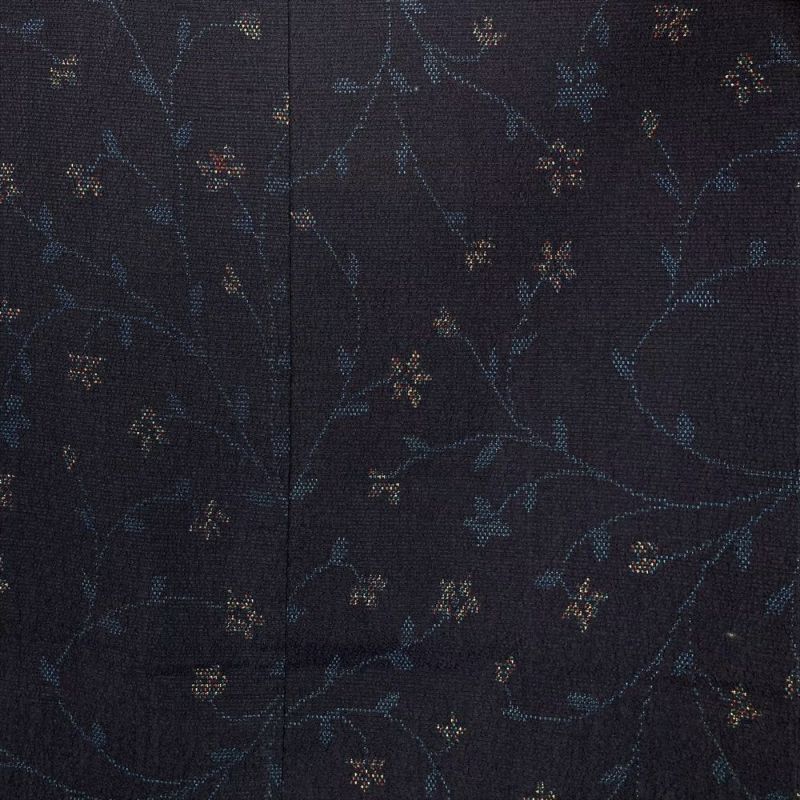 (中古)紬 黒 カジュアル 織り 蔓花 袷 SS【身丈】154cm【裄丈】63cm