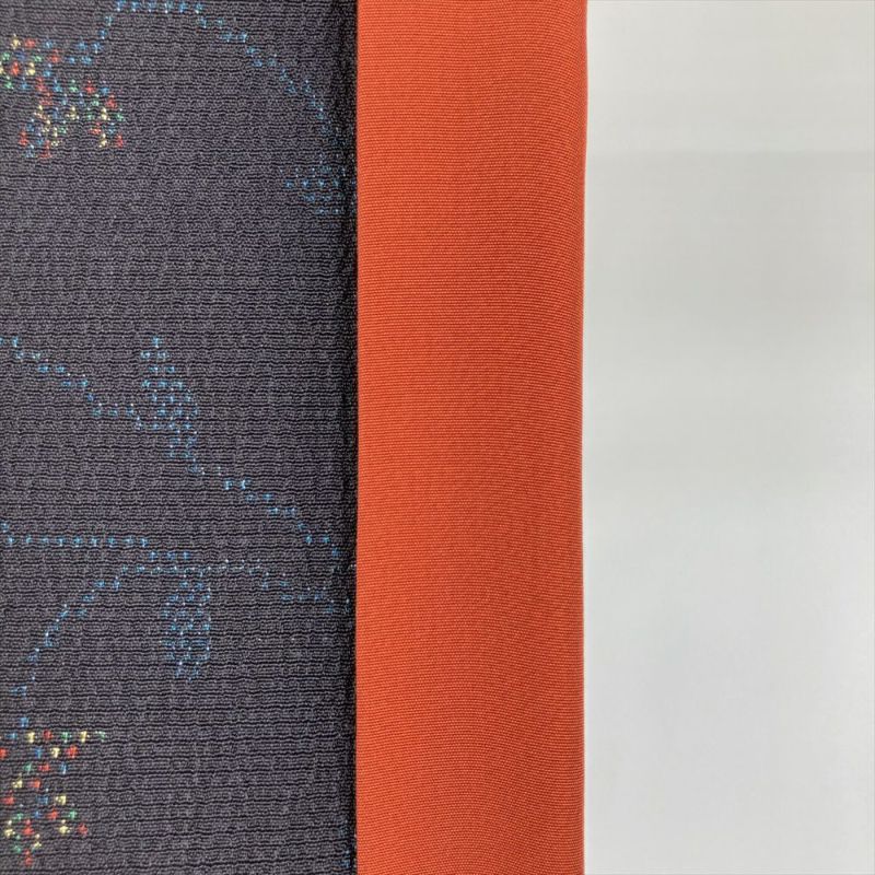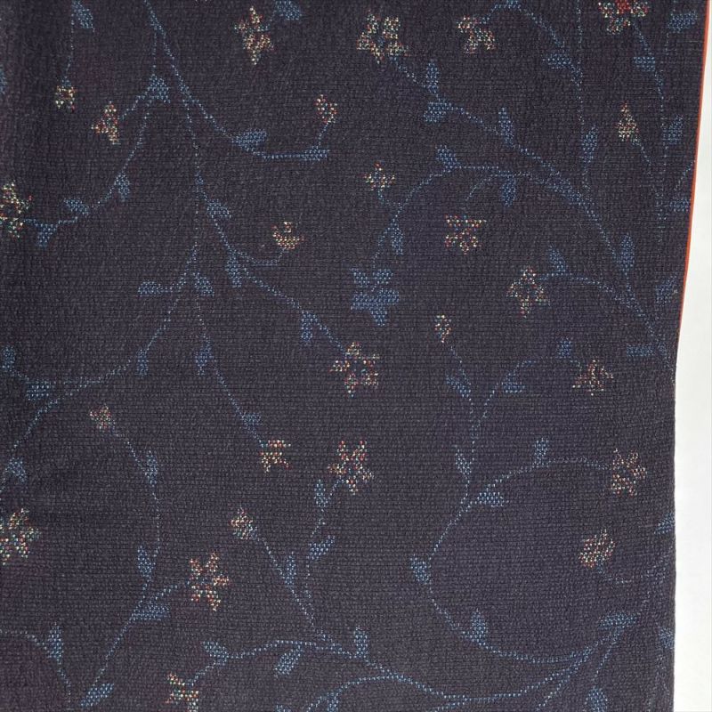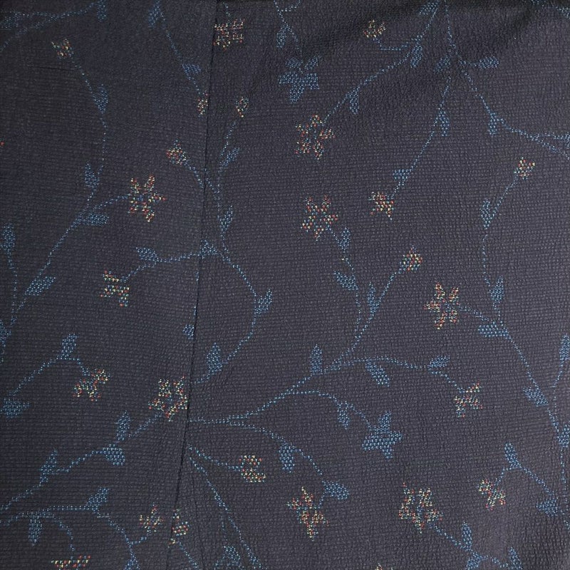 表面に細かいシボ状の風合いがあるため、薄手でザラザラとした手触りを感じます。普段着やおしゃれ着として使えるカジュアルなお着物です。胴裏にシミ汚れがございます。裾回しに色抜けがございます。保存臭がややございます。十日町紬 しつけあり。