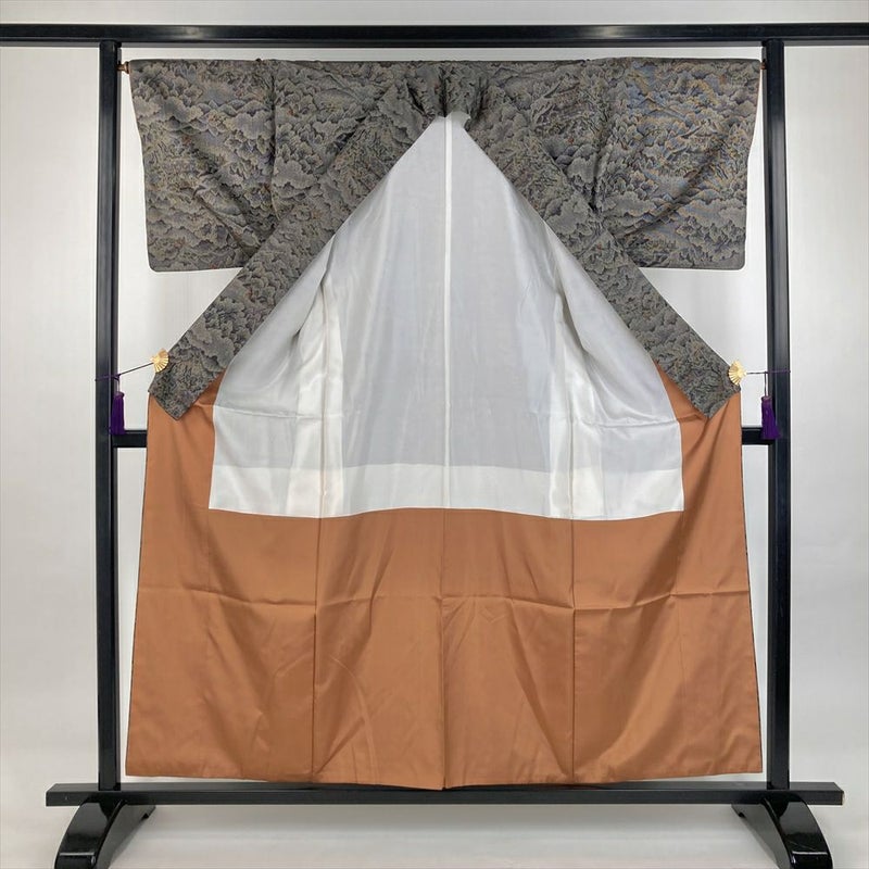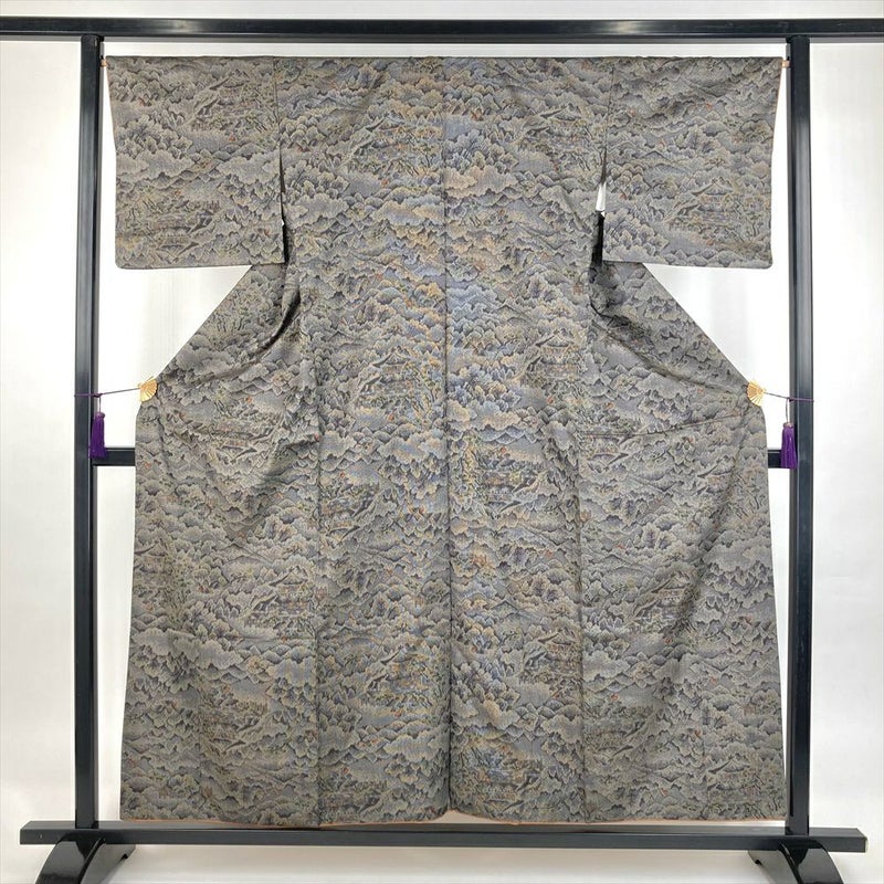 (中古)紬 墨黒 ベージュ カジュアル 織り 金閣寺 袷 SS【身丈】152.5cm【裄丈】66.5cm