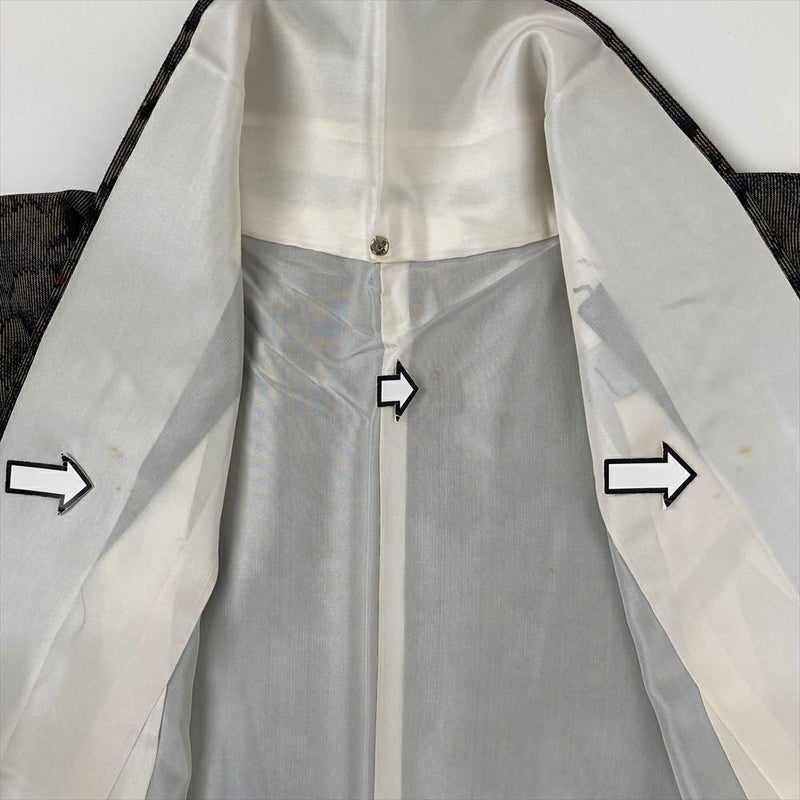 ひかえめな光沢があり、手触りや肌触りがよく軽くて丈夫です。普段着やおしゃれ着として使えるカジュアルなお着物です。衿裏、胴裏にシミ汚れがございます。保存臭がややございます。十日町紬