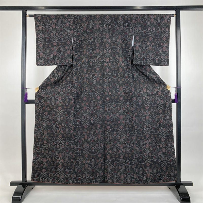 (中古)紬 黒 カジュアル 織り 蔓花 オリエンタル 袷 SS【身丈】154cm【裄丈】63.5cm