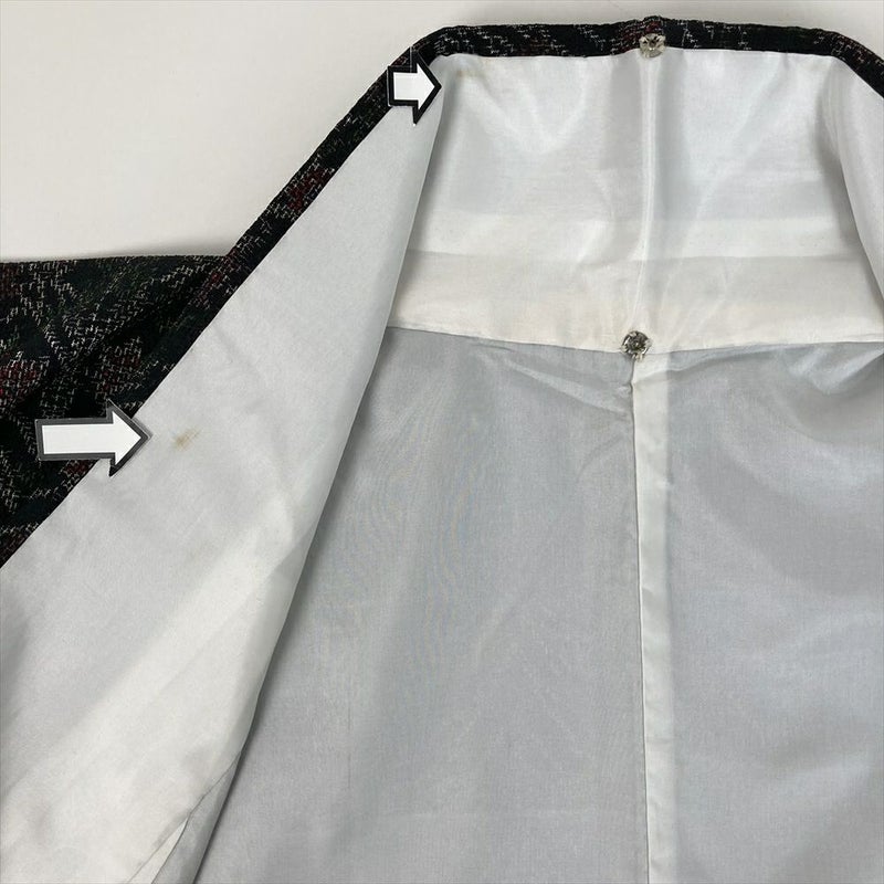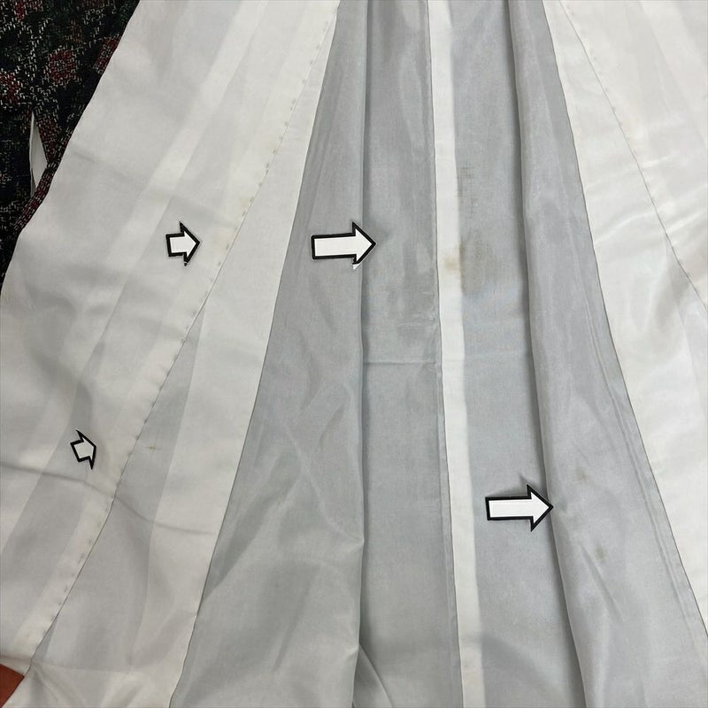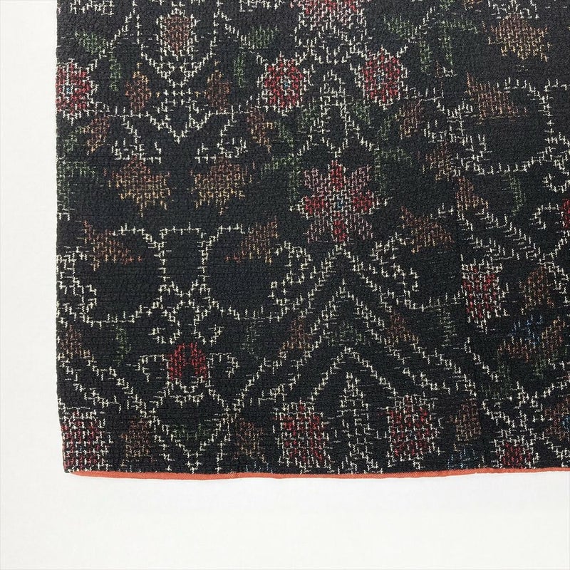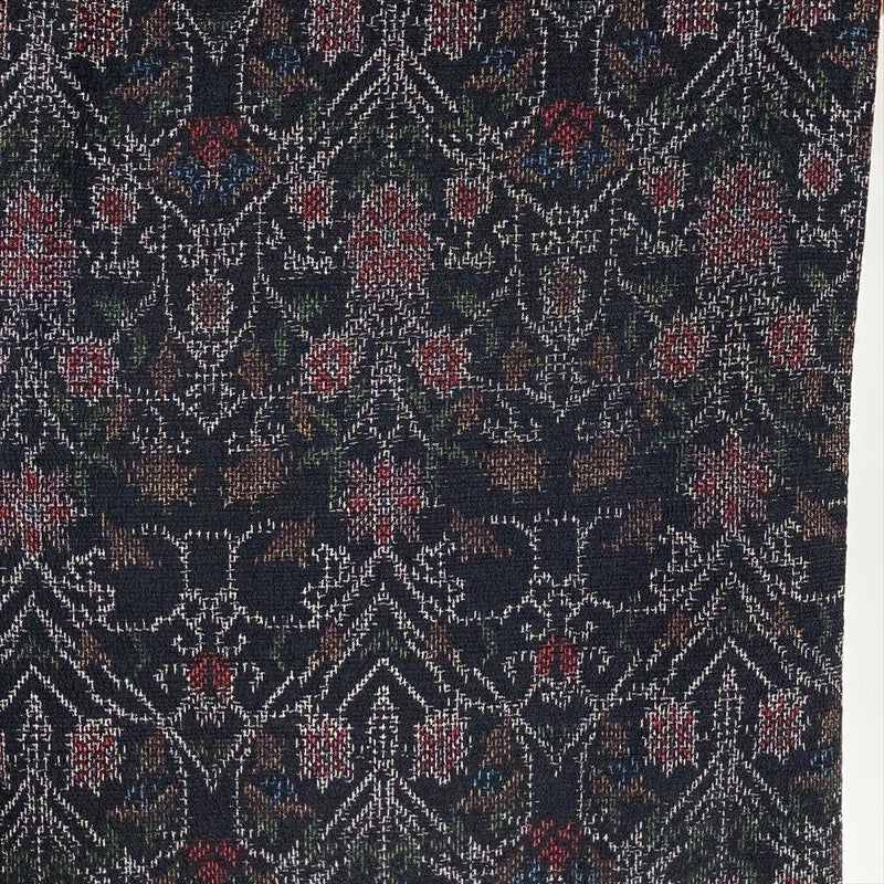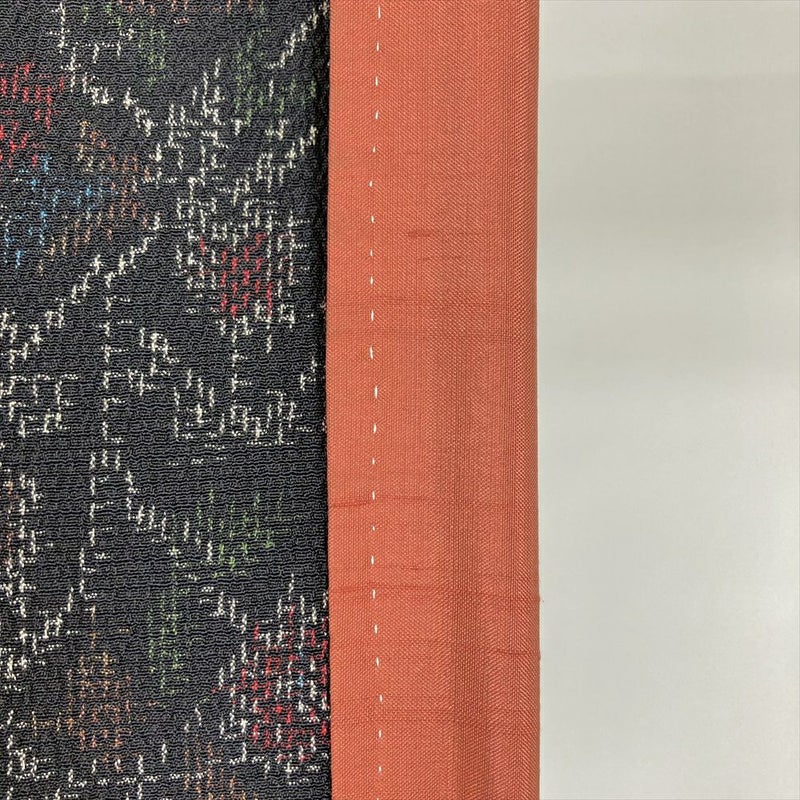 表面に細かいシボ状の風合いがあるため、薄手でザラザラとした手触りを感じます。普段着やおしゃれ着として使えるカジュアルなお着物です。胴裏にシミ汚れがございます。保存臭がややございます。