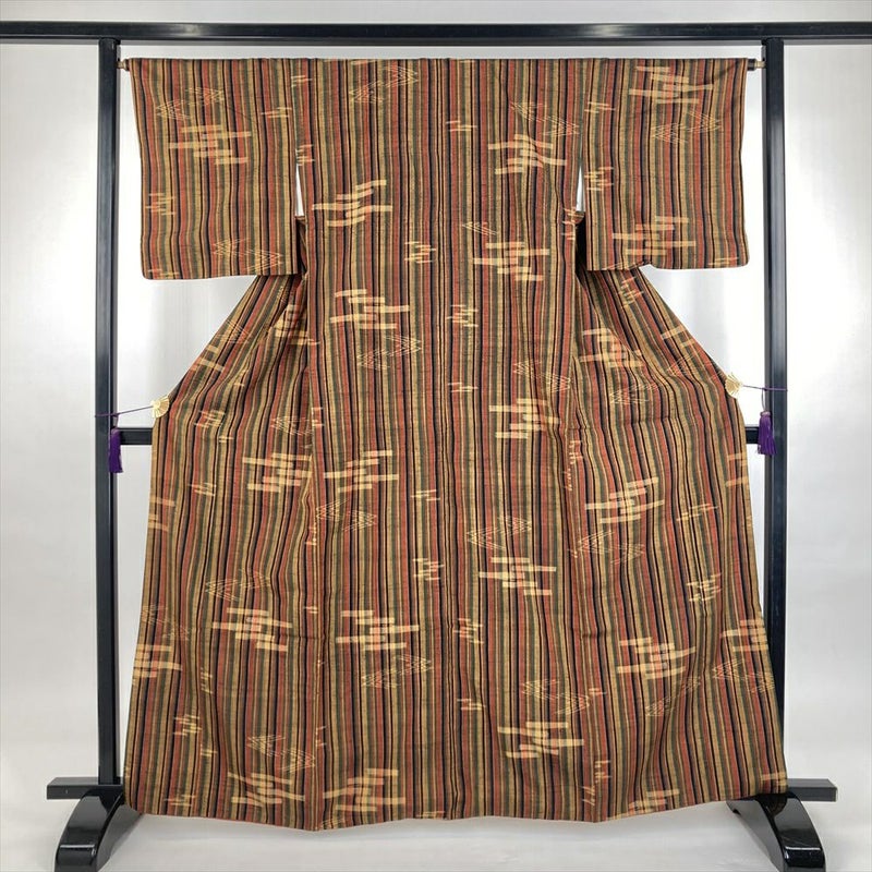 (中古)紬 薄橙 オレンジ 柿色 緑 カジュアル 織り 変わり縞に幾何学 袷 M【身丈】160cm【裄丈】65cm