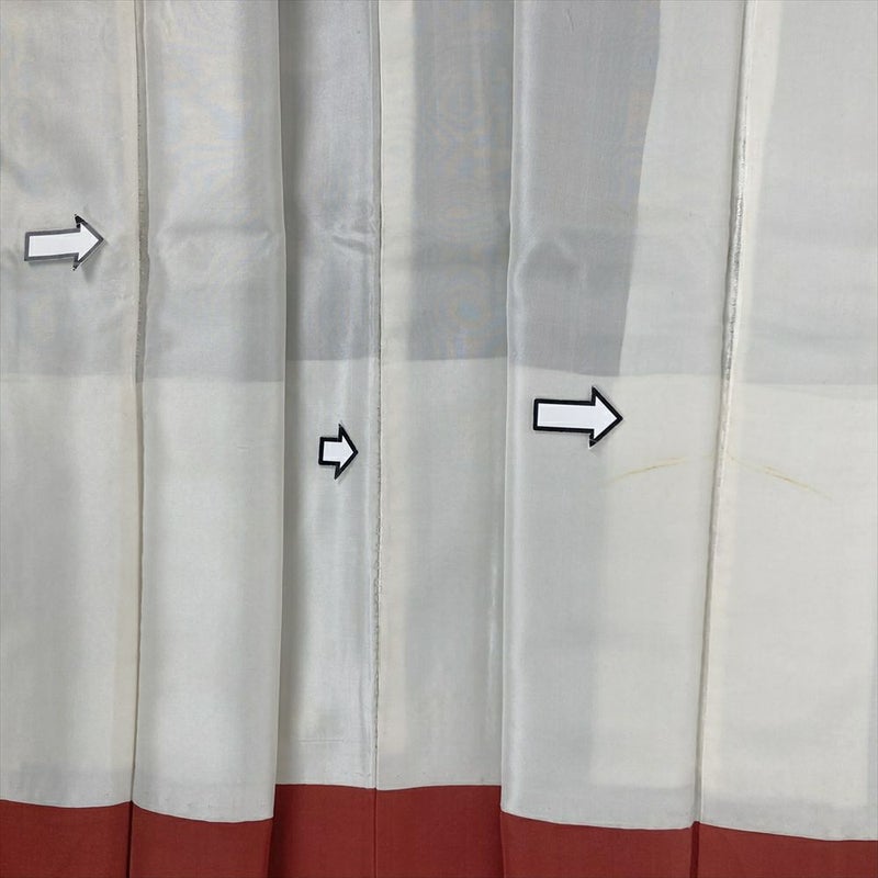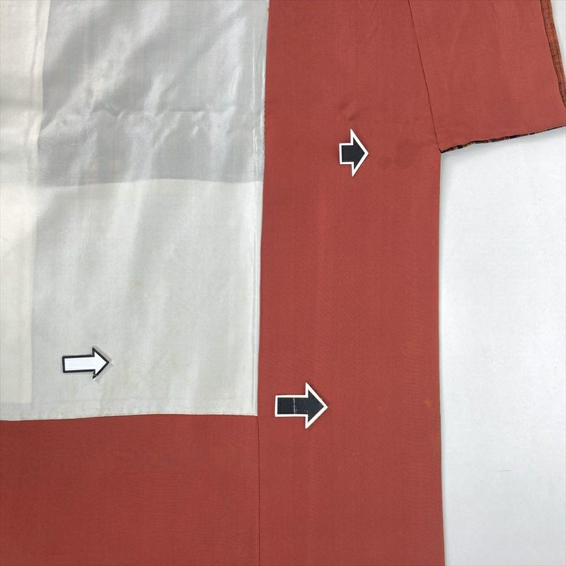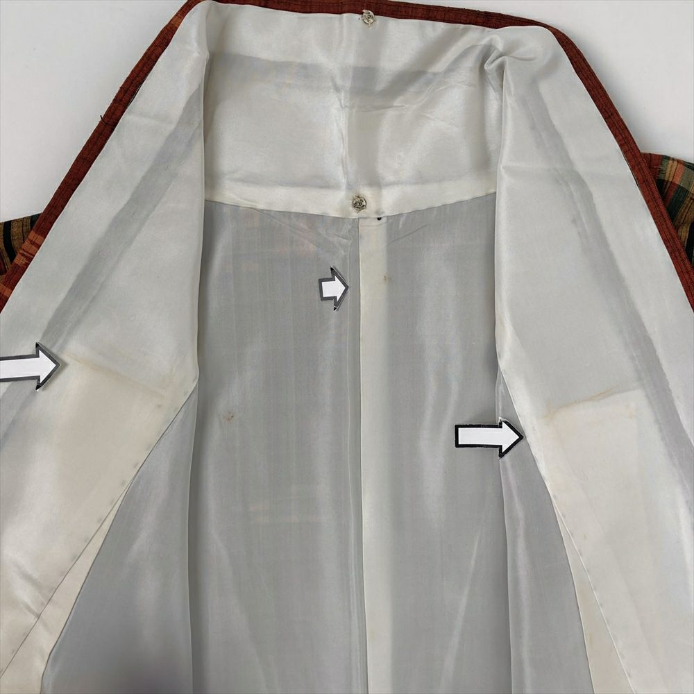 生地に厚みがあり耐久性にも優れています。細かいフシのある生地感は流行や時代に左右されません。普段着に、ちょっとしたお出かけに着用いただけます。衿裏、胴裏にシミ汚れがございます。背縫い、脇縫い、身八つ口縫い目と生地に弱りがございます。胴裏に着用シワがございます。保存臭がややございます。十日町紬