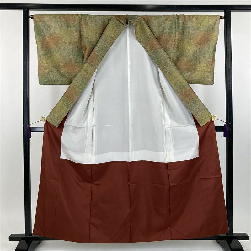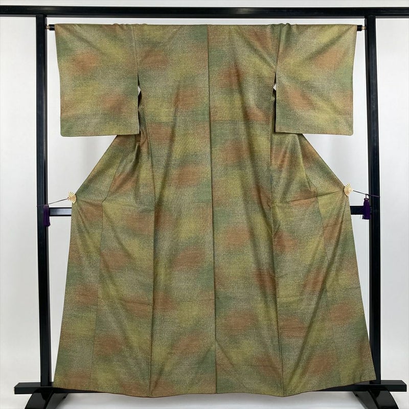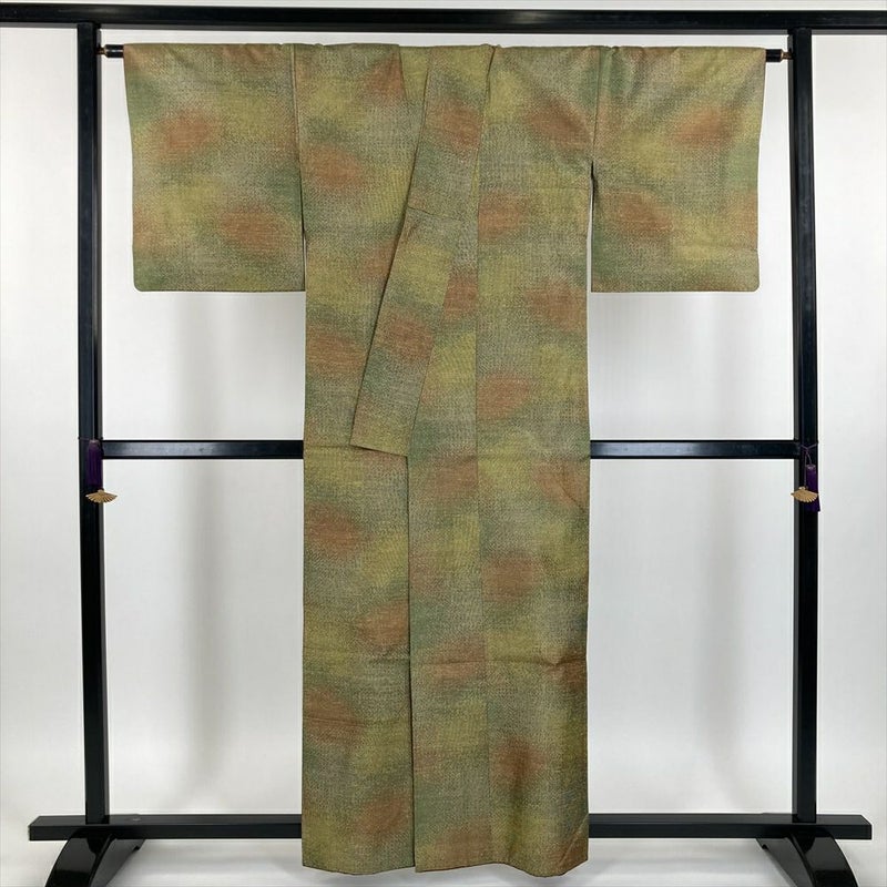 (中古) 紬 黄緑色 カジュアル 絣柄 モザイク柄 袷【身丈】156cm【裄丈】65cm