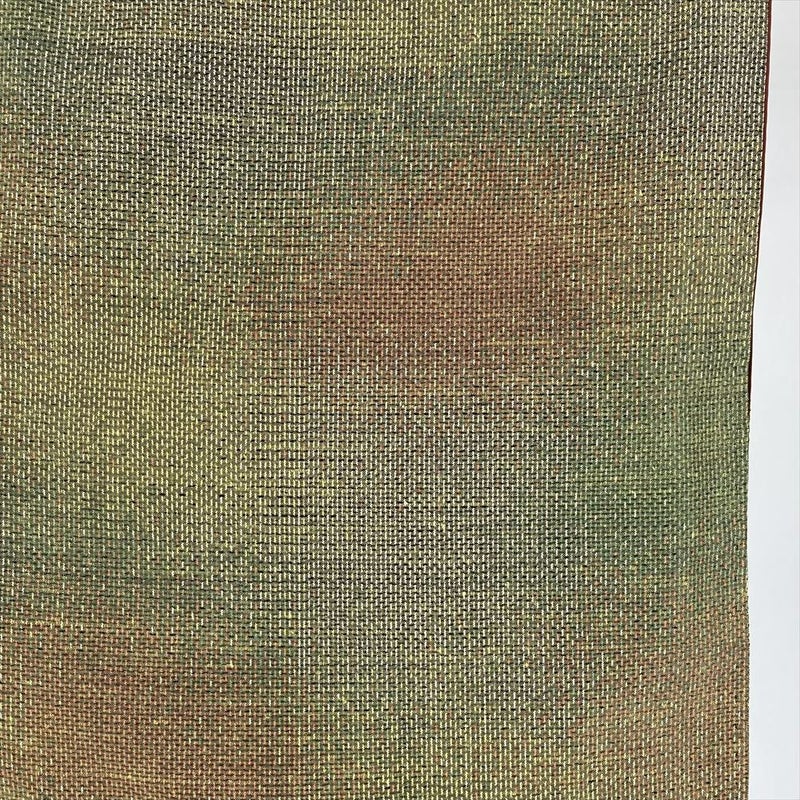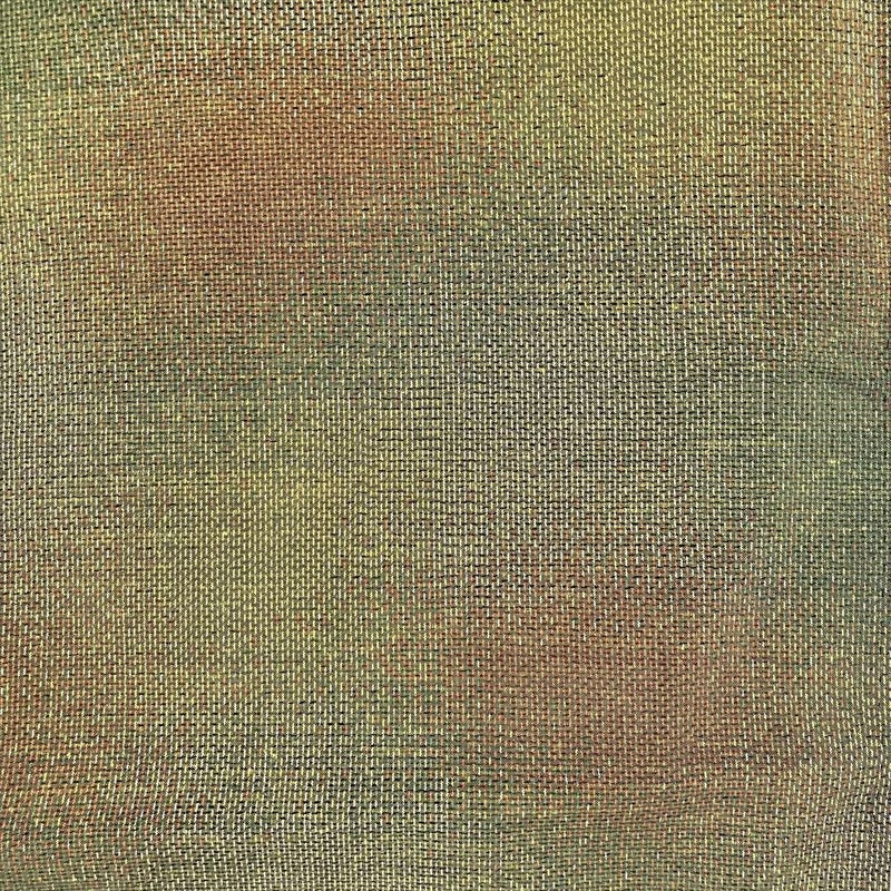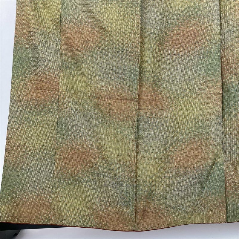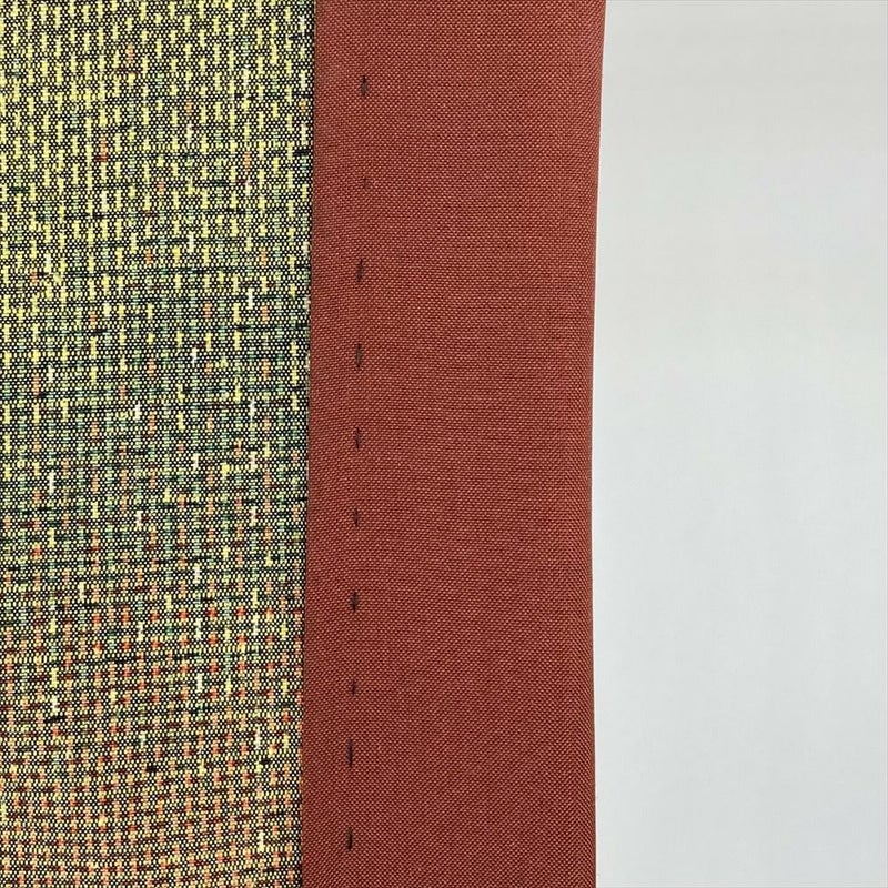 黄色と緑色が織りなす、鮮やかなモザイク柄の絣が目を引く一枚。温かみのある手触りと、しっとりとした光沢が特徴です。