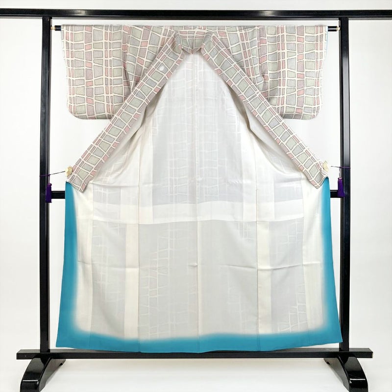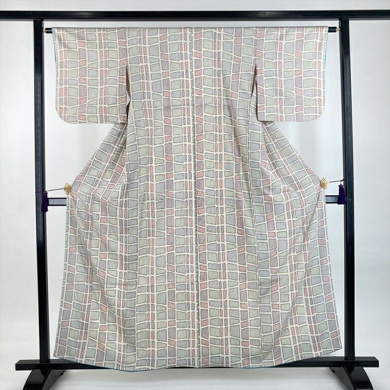 (中古)紬 白 カジュアル 織り 変わり格子 袷 S【身丈】155.5cm【裄丈】63cm