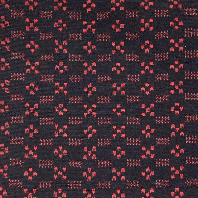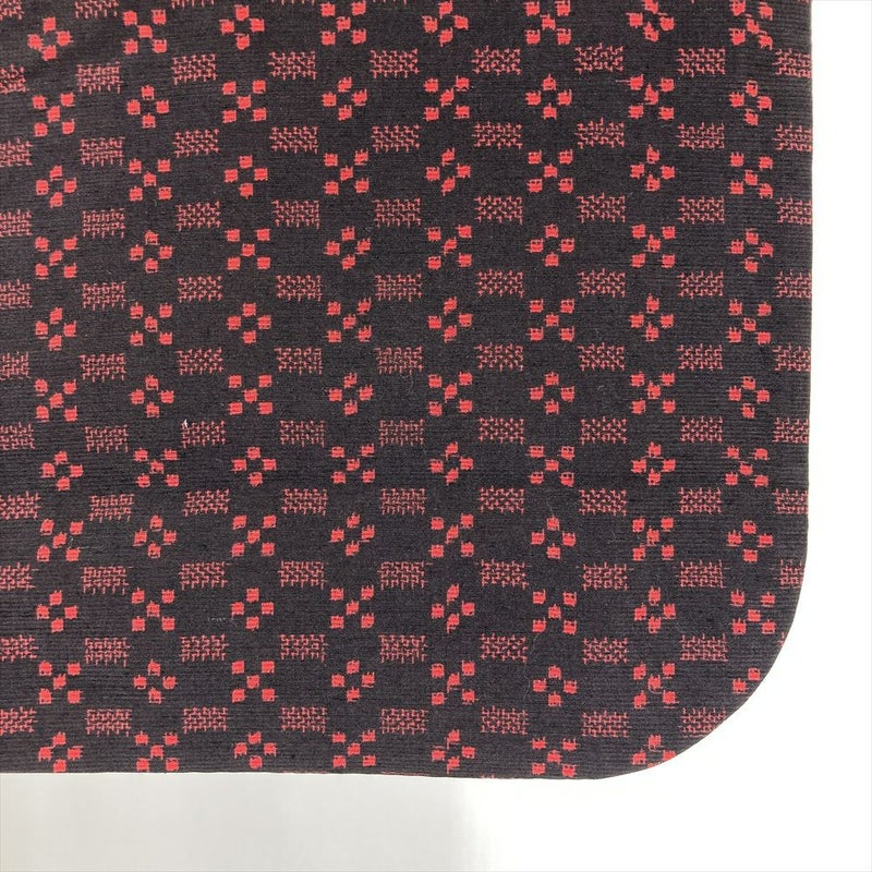 漆黒の地に鮮やかな赤が映える、規則的な意匠が特徴です。