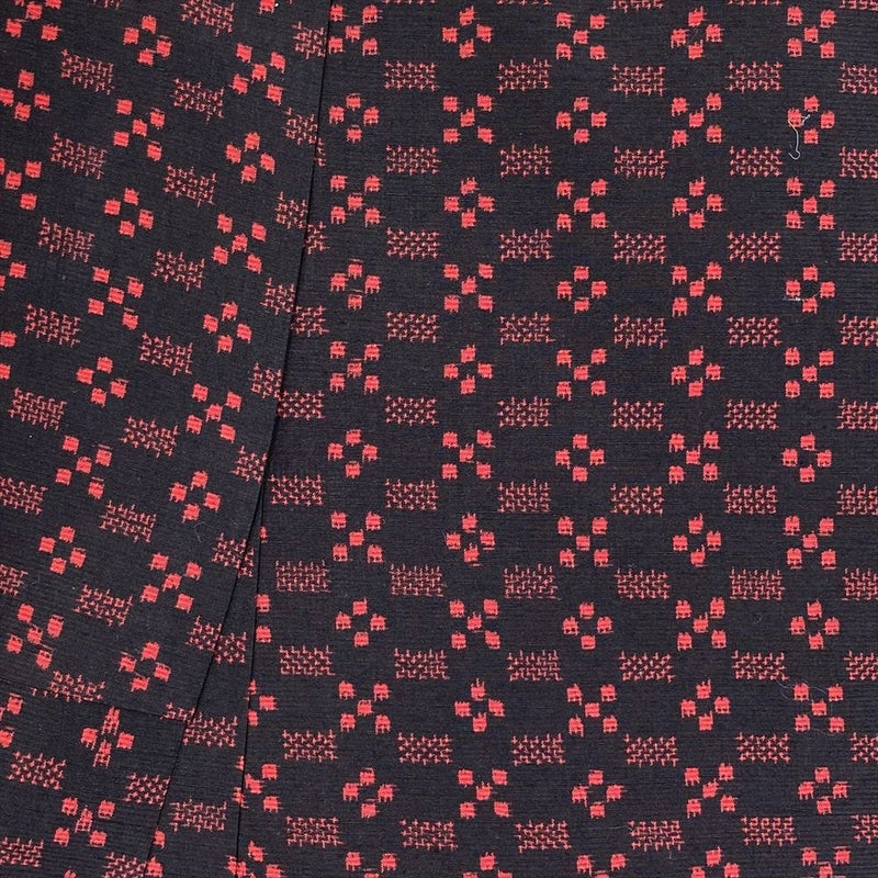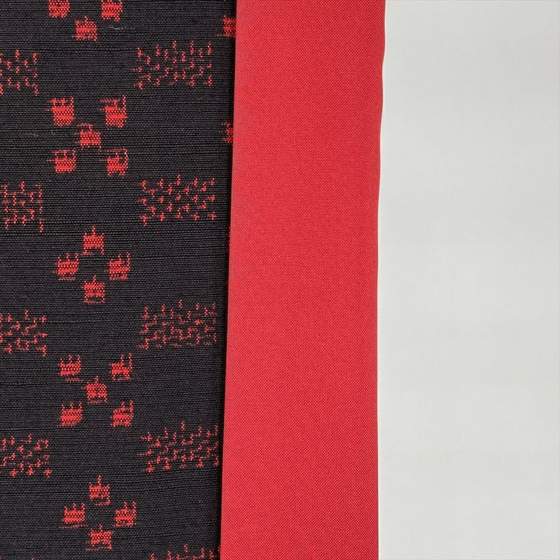 <div class=黒と赤の対比がモダンなパターン柄の紬