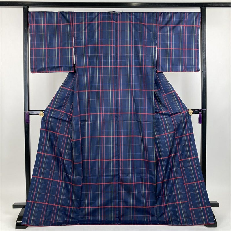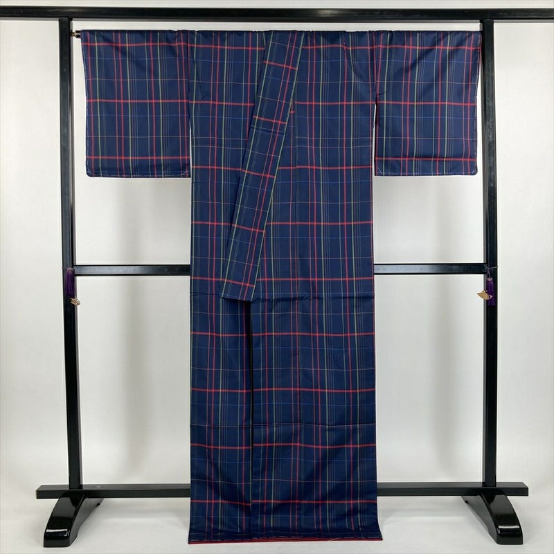 (中古) 紬 紺色 カジュアル 織り 格子柄 袷【身丈】169cm【裄丈】70cm