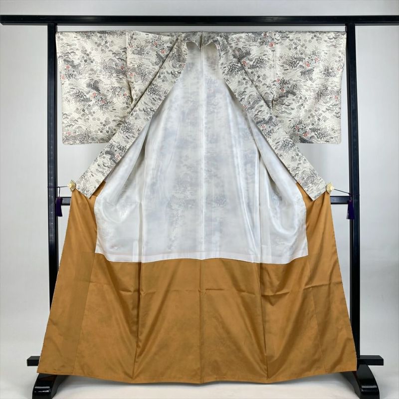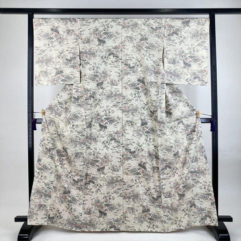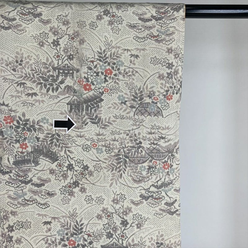 (中古)紬 生成り カジュアル 織り 四季の草花 家屋と垣根 袷 M【身丈】163cm【裄丈】68cm