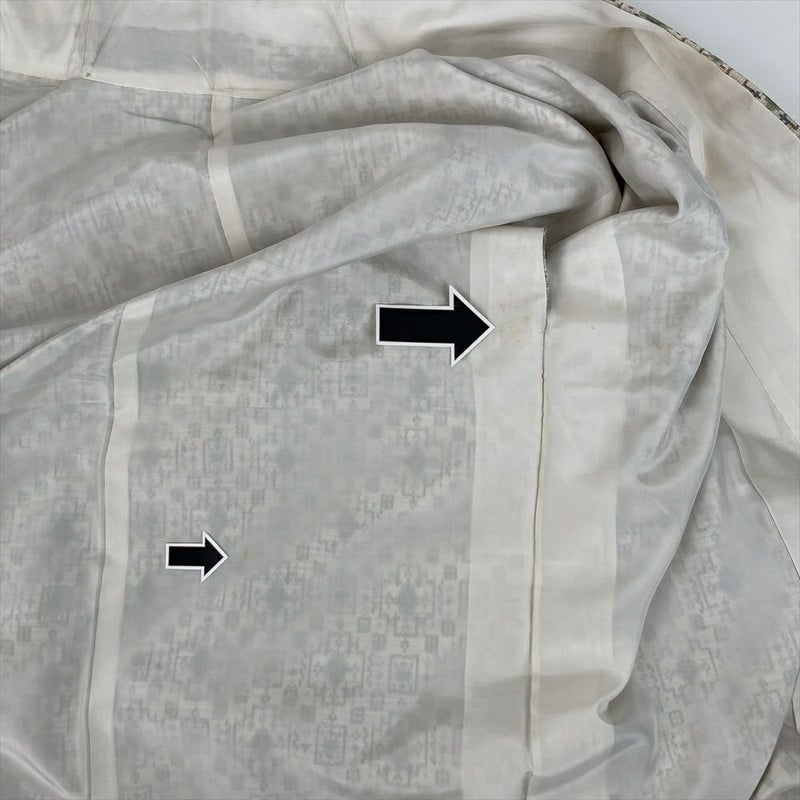 紬の生地は厚みがあり耐久性にも優れています。細かいフシのある生地感は流行や時代に左右されません。カジュアル向きです。普段着に、ちょっとしたお出かけに着用いただけます。左前袖、左前後身、右肩、裾回し(裾)にシミ汚れがございます。保存臭がややございます。