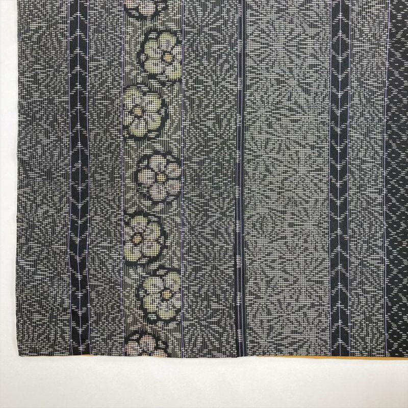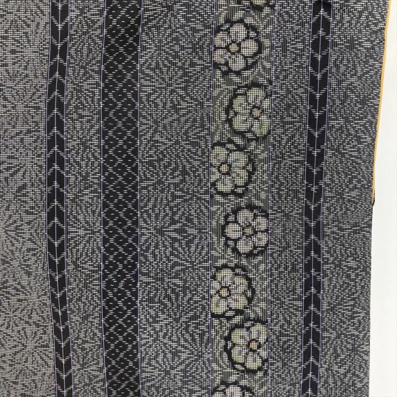 (中古)紬 黒 薄灰 グレー カジュアル 織り 縦に花柄 矢羽根 菱 袷 M【身丈】160cm【裄丈】66cm