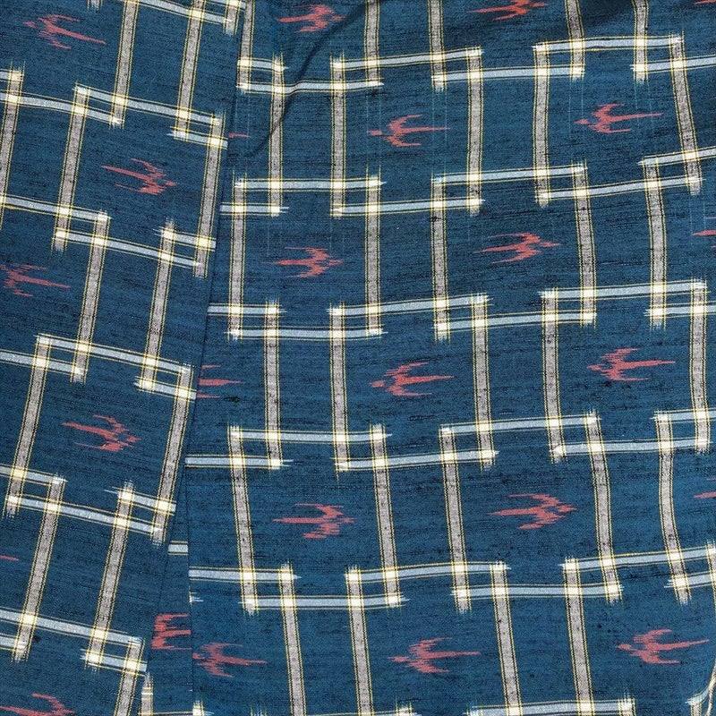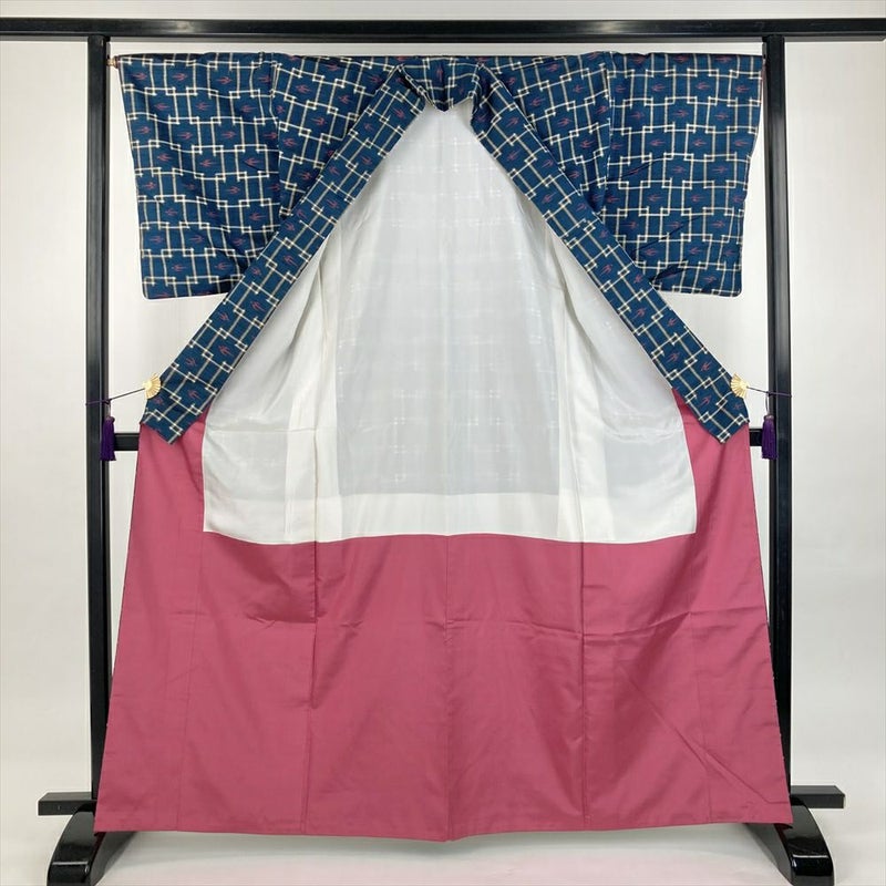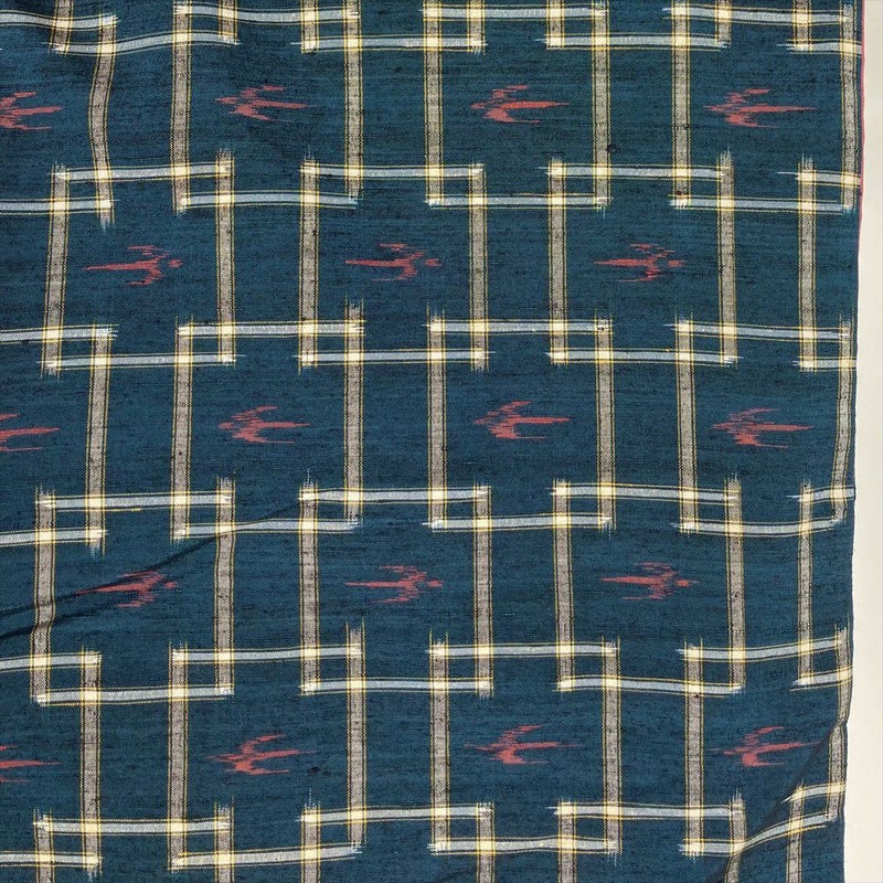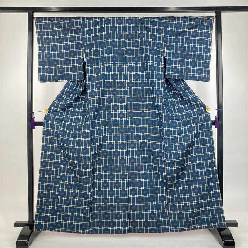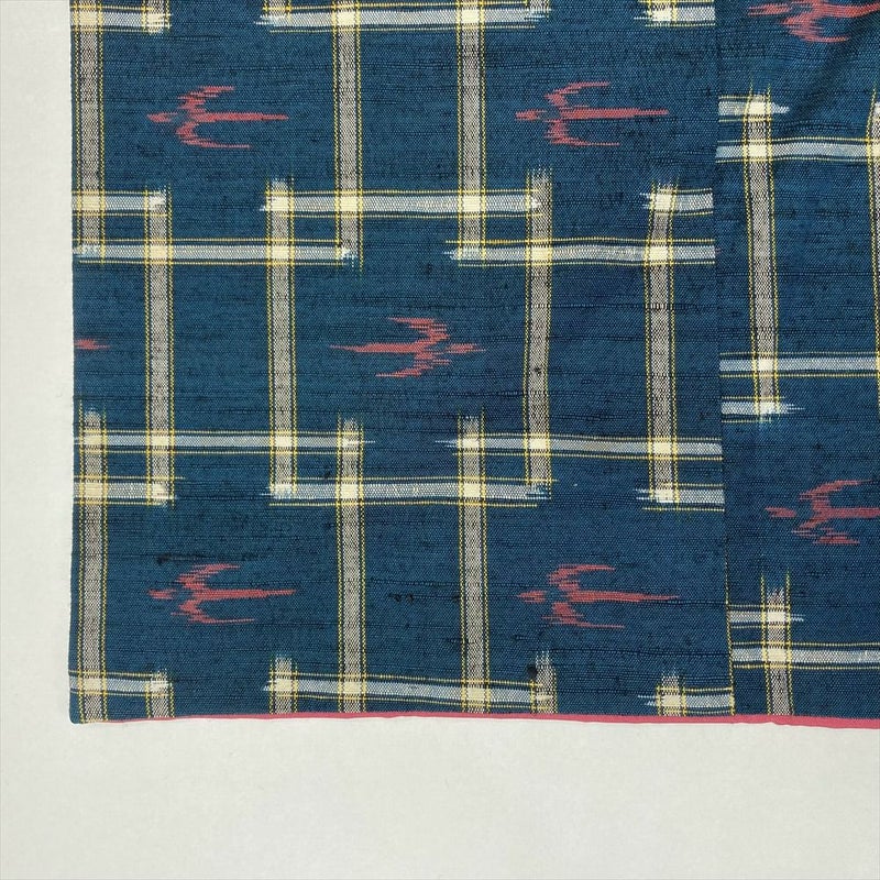 (中古)紬 紺 カジュアル 織り つばめ 井戸 琉球柄 袷 M【身丈】161cm【裄丈】67cm