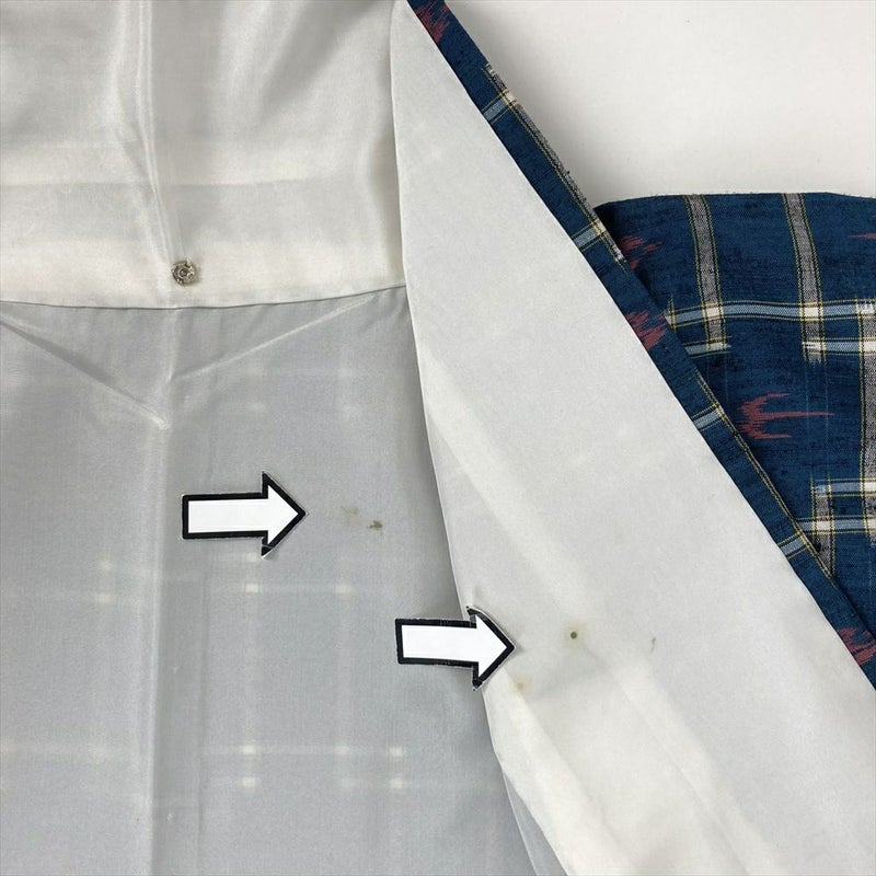 生地に厚みがあり耐久性にも優れています。細かいフシのある生地感は流行や時代に左右されません。普段着に、ちょっとしたお出かけに着用いただけます。衿裏、胴裏にシミ汚れがございます。左前身、両袖にシワがございます。保存臭がややございます。