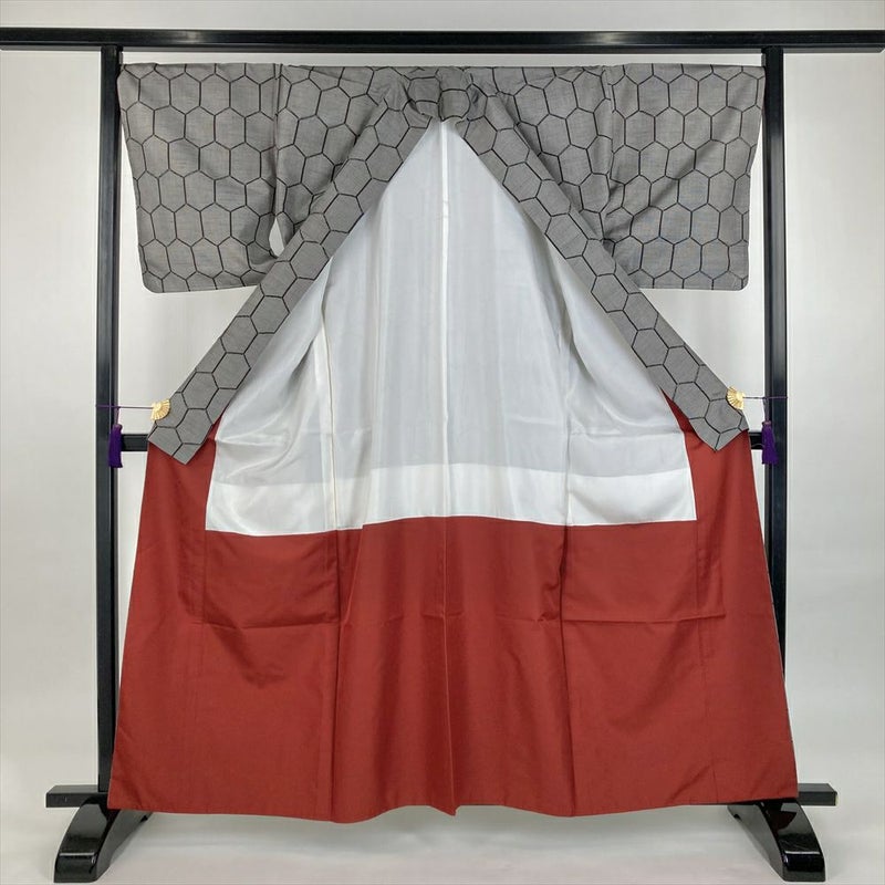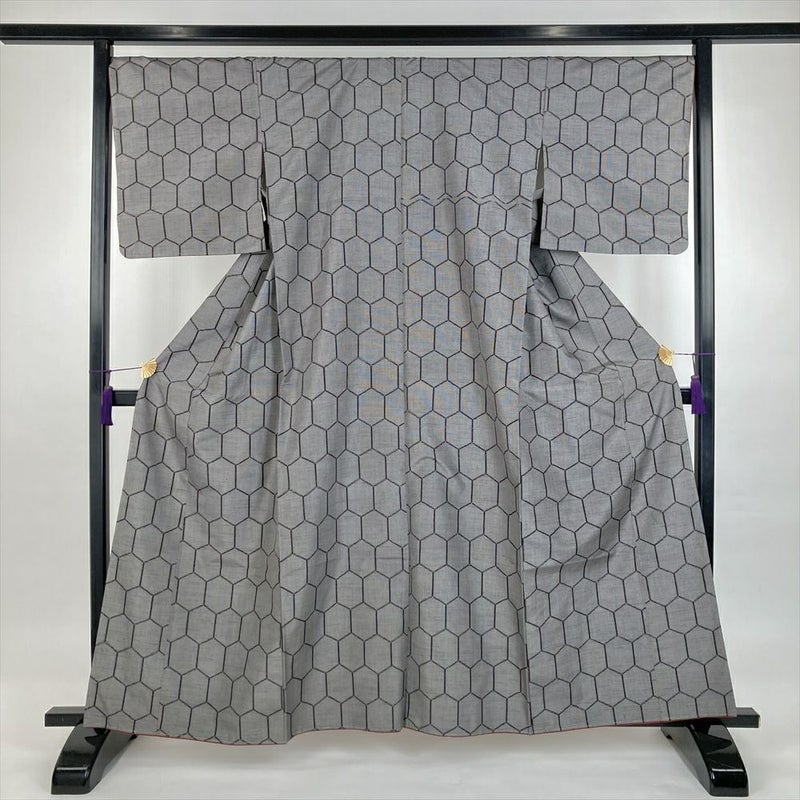 (中古)紬 灰色 グレー カジュアル 織り 亀甲つなぎ 袷 S【身丈】156cm【裄丈】68.5cm