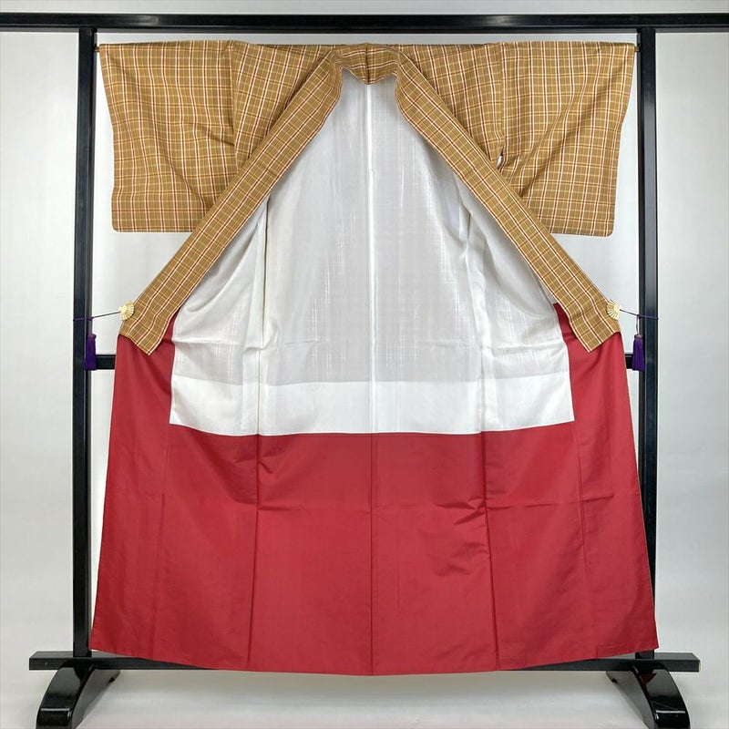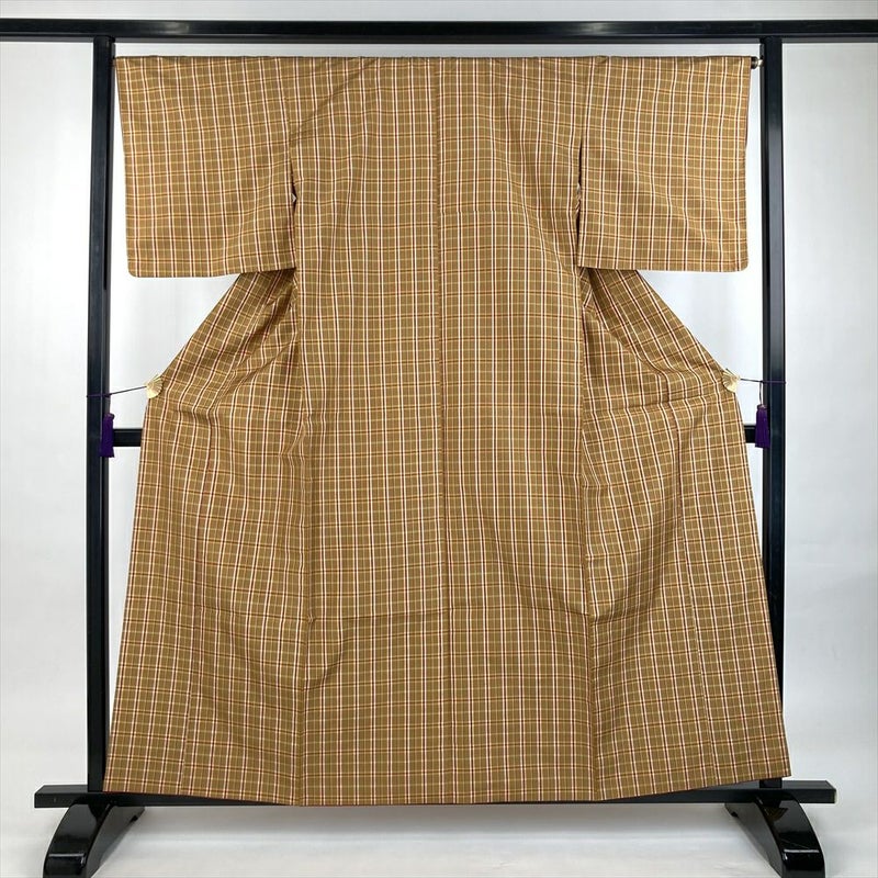 (中古)紬 小麦色 ベージュ カジュアル 織り 格子 袷 S【身丈】156.5cm【裄丈】66.5cm