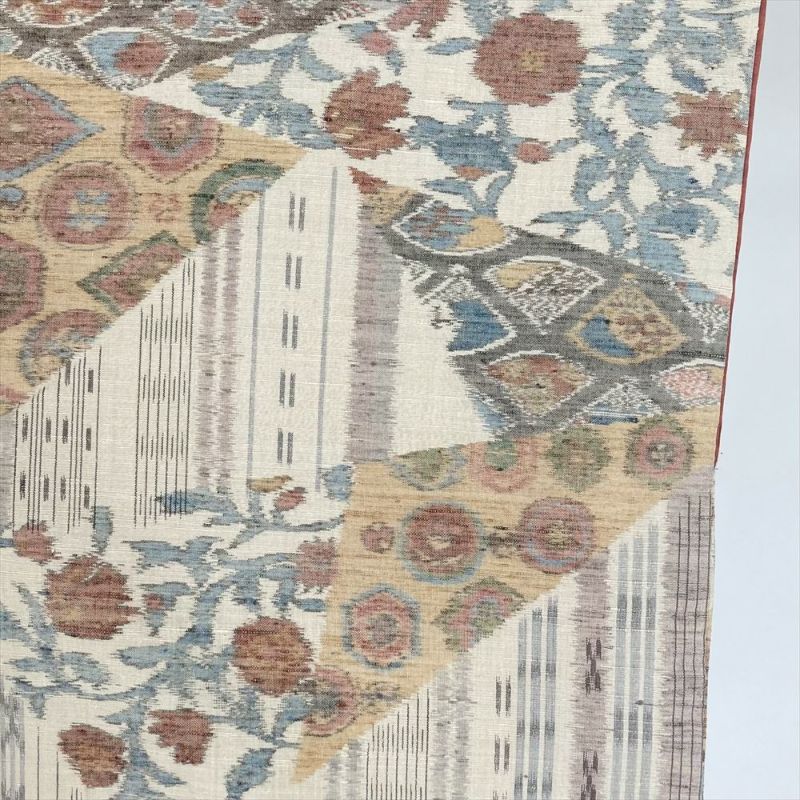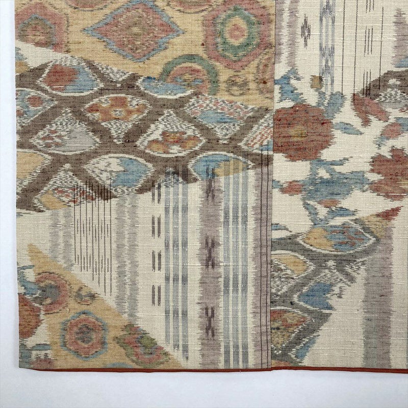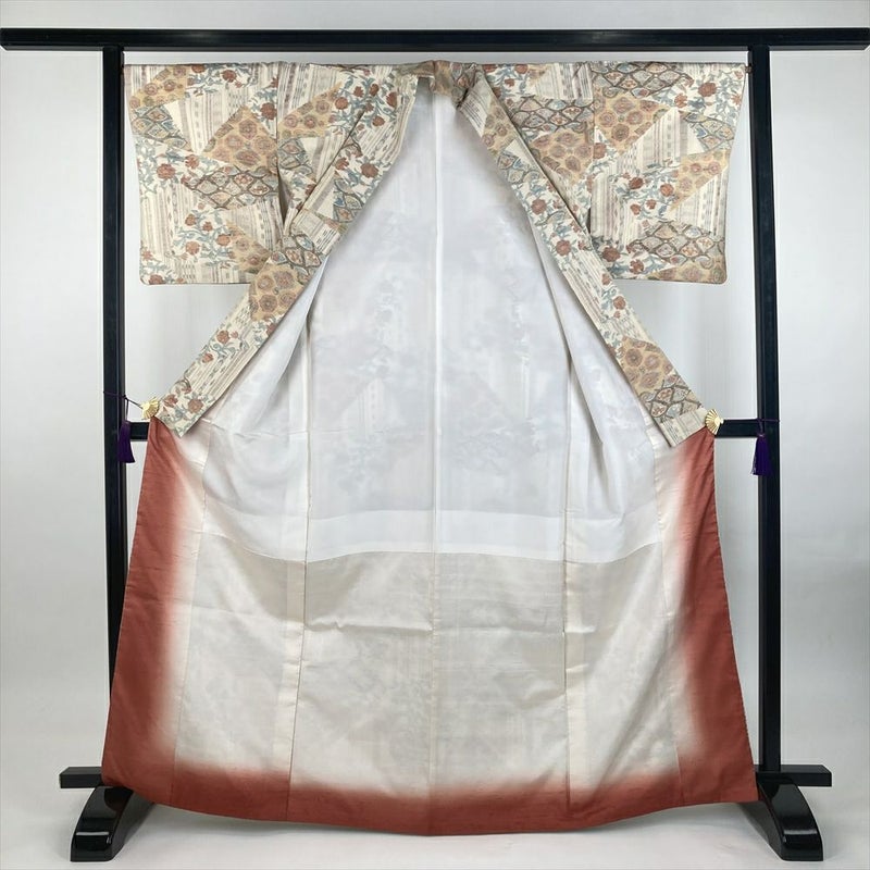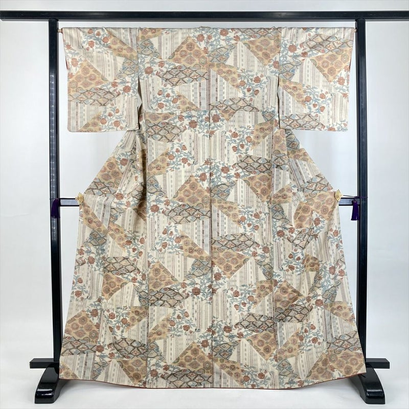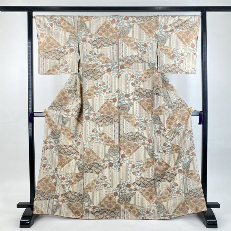 (中古)紬 生成り クリーム カジュアル 織り 切り嵌め 扇子 丸文 唐花 袷 M【身丈】162.5cm【裄丈】66.5cm