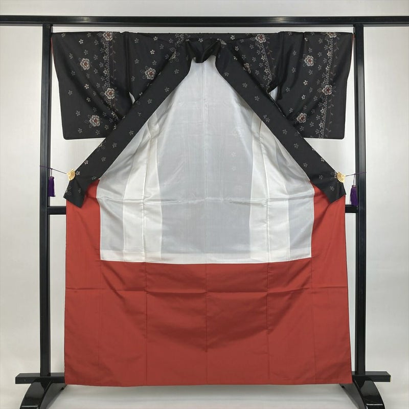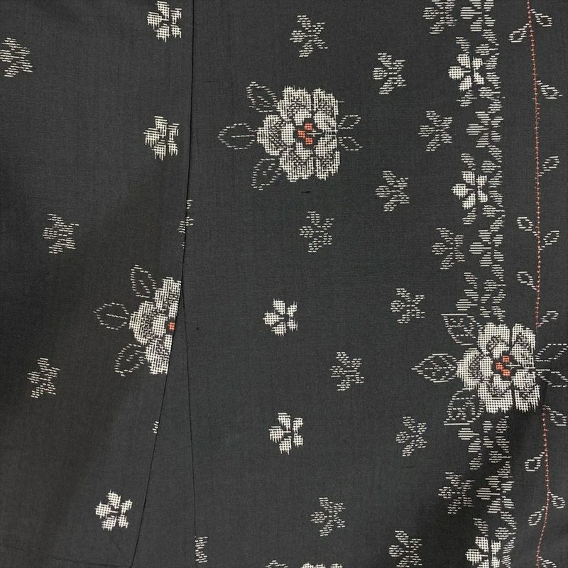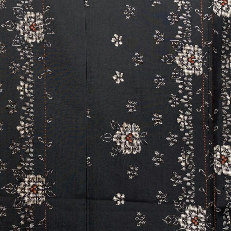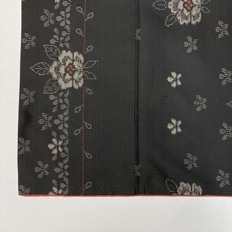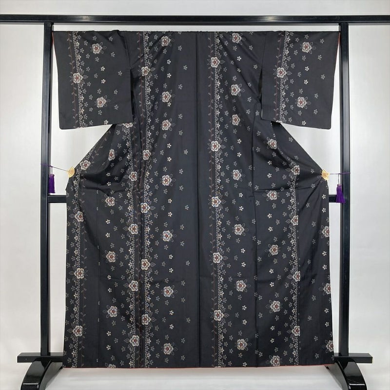 (中古)紬 黒 カジュアル 織り 縦に花柄 袷 M【身丈】161cm【裄丈】68.5cm
