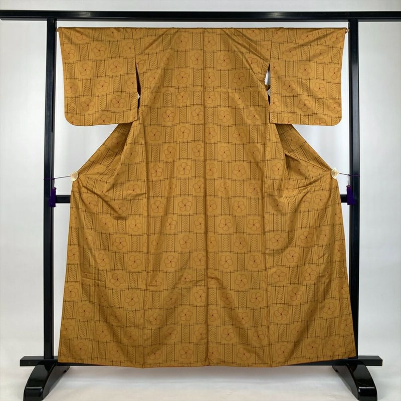 (中古)紬 鬱金 黄土色 カジュアル 織り 変わり市松 梅 袷 S【身丈】158.5cm【裄丈】66.5cm