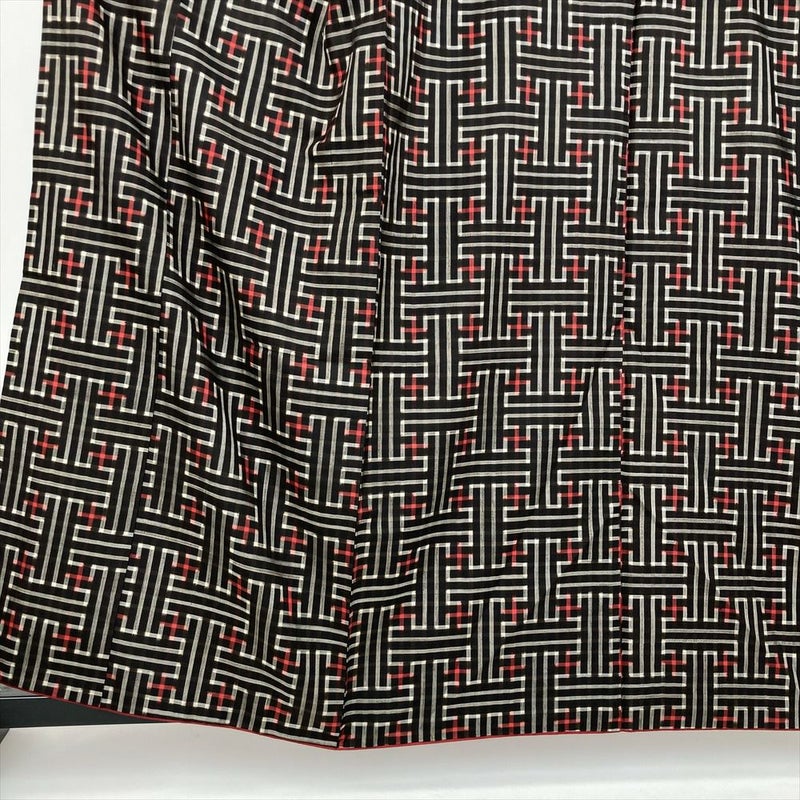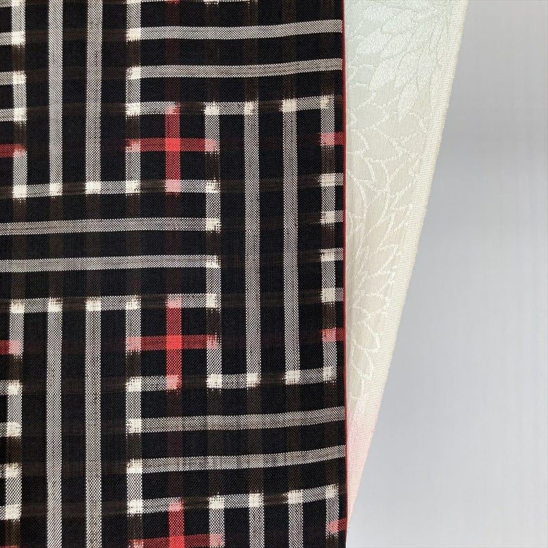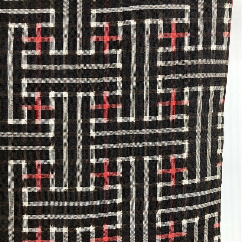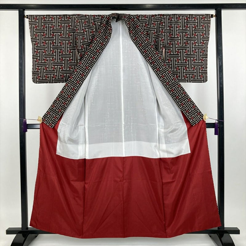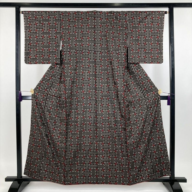 深みのある焦げ茶色が美しい、洗練された幾何学模様の紬です。 さらりとした肌触りが心地よく、快適に着こなせますので、着物初心者さんも気軽に楽しめます。帯や小物を替えるだけで、印象がガラリと変わります。 ちょっとしたお出かけや、友人との食事会など、様々なシーンで活躍します。保存臭がややございます。うそつき袖付き